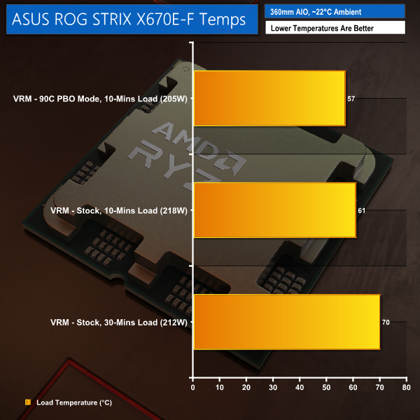 VRM cooling on the ASUS X670E-F Gaming WiFi is solid. Big, chunky heatsinks and a massively oversized VRM make this an unsurprising result.