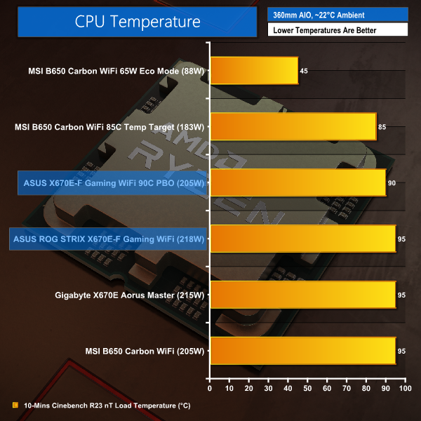 Power draw from the ROG STRIX X670E-F Gaming WiFi is a little lower than the Gigabyte and MSI comparisons that we use. That’s for test system wall power consumption, I should add, as package power readings tended to be a little high on ASUS.