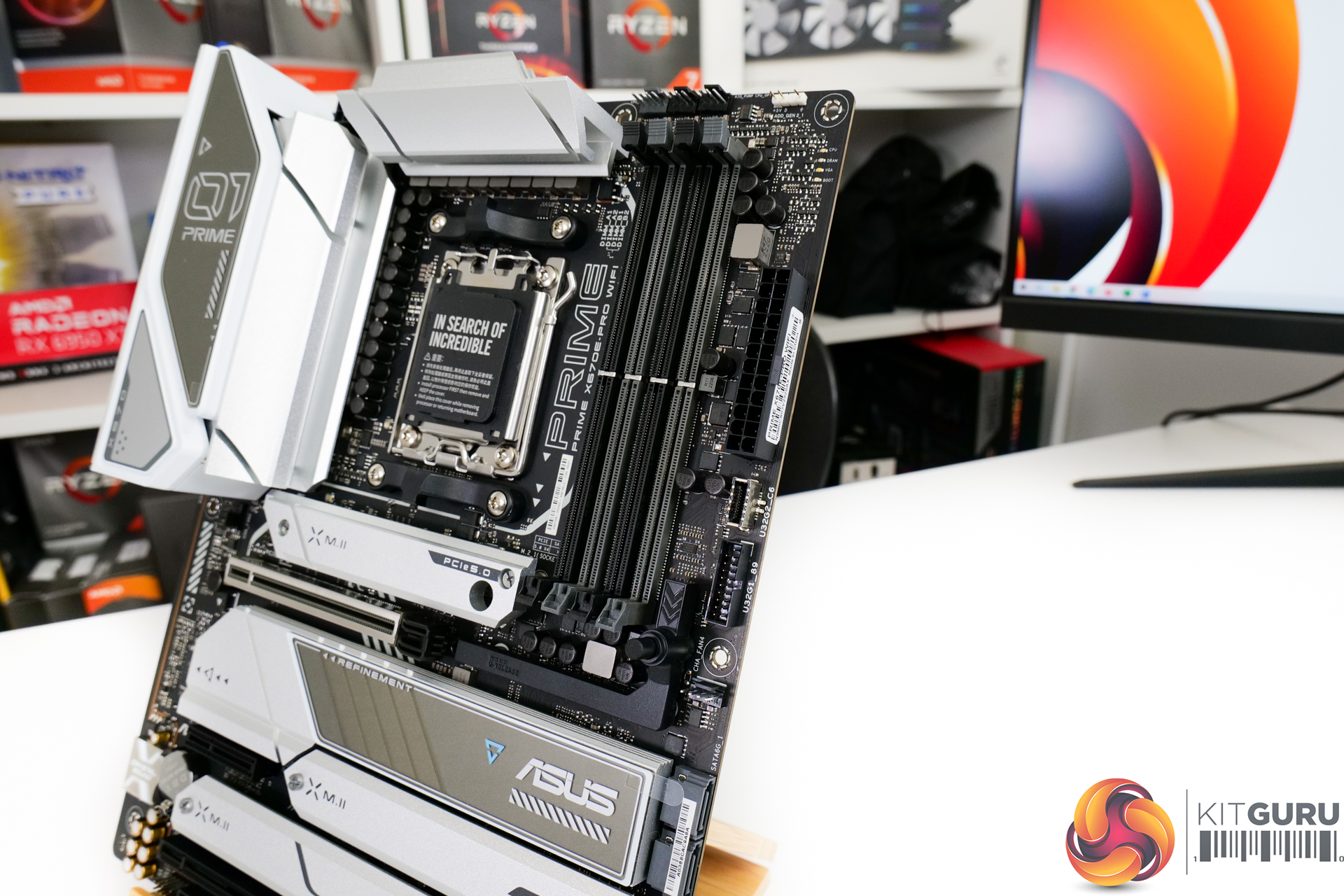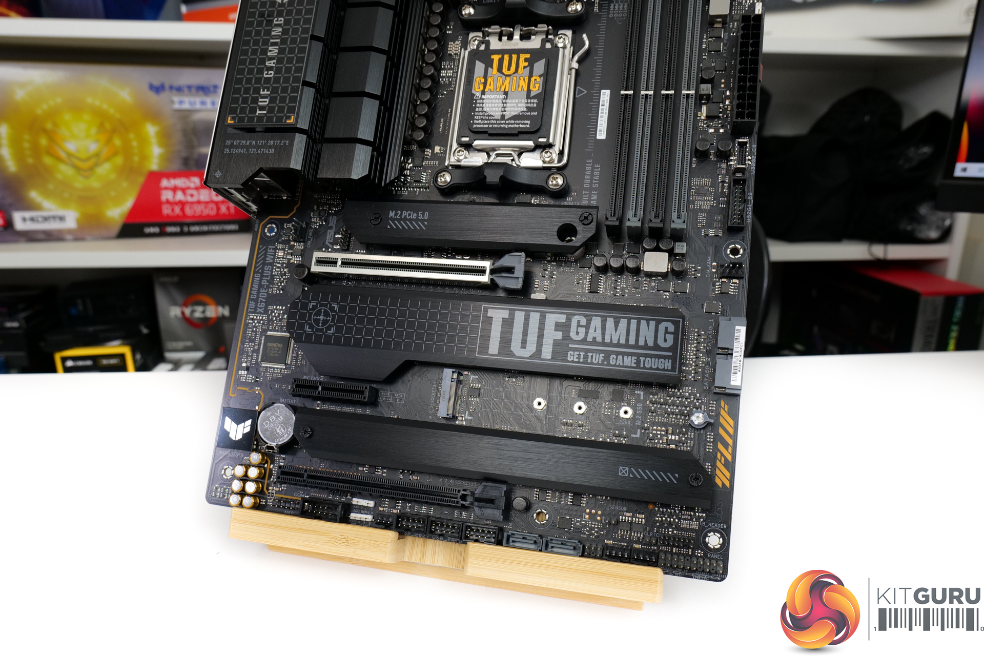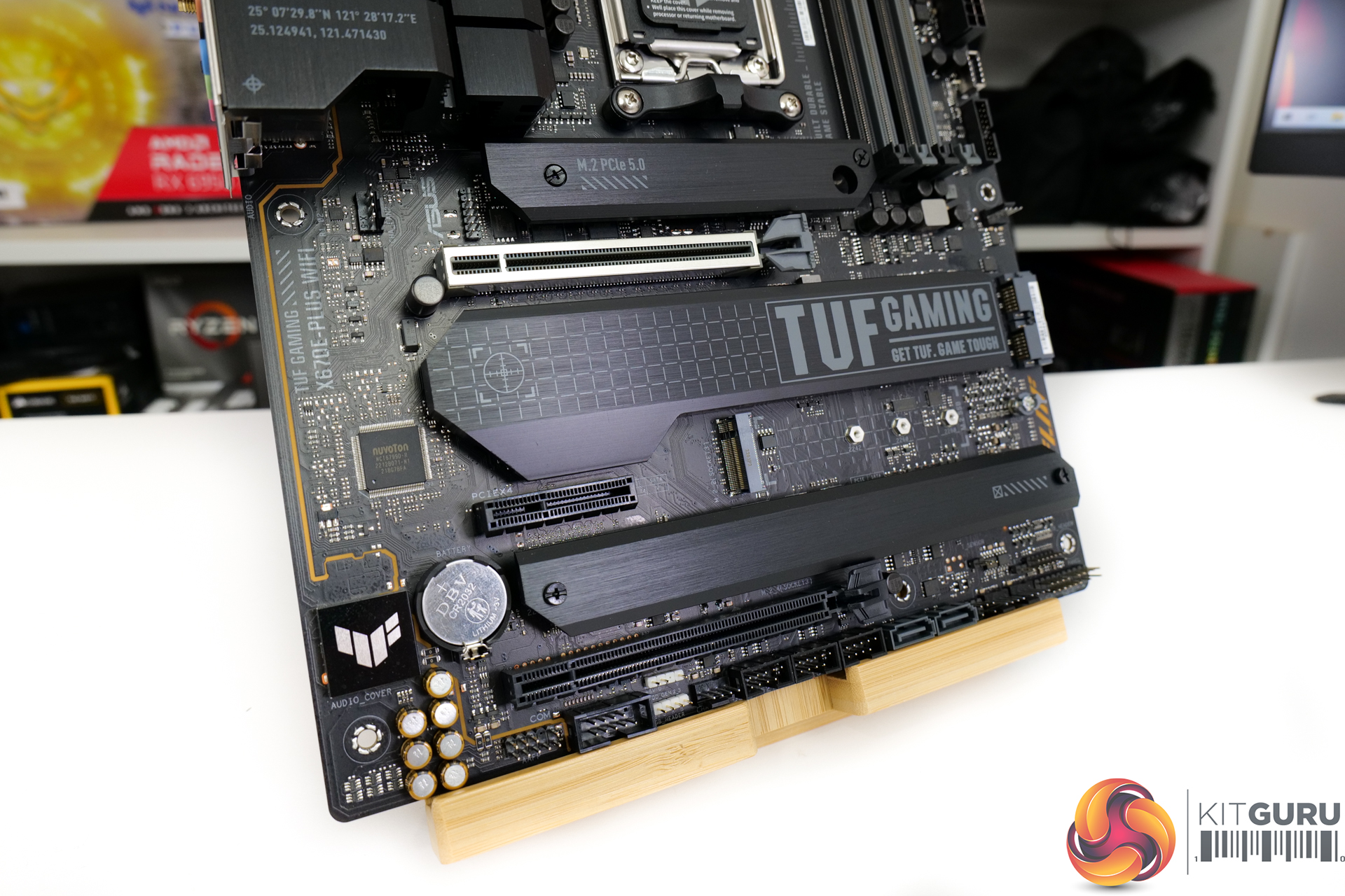 ASUS’ TUF Gaming X670E-Plus WiFi and Prime X670E-Pro WiFi primarily differ by their appearance. ASUS’ Prime board goes for the usual silver/white and black colour scheme alongside a touch of RGB lighting on the rear IO cover, while the TUF Gaming alternative is dark greys and blacks.