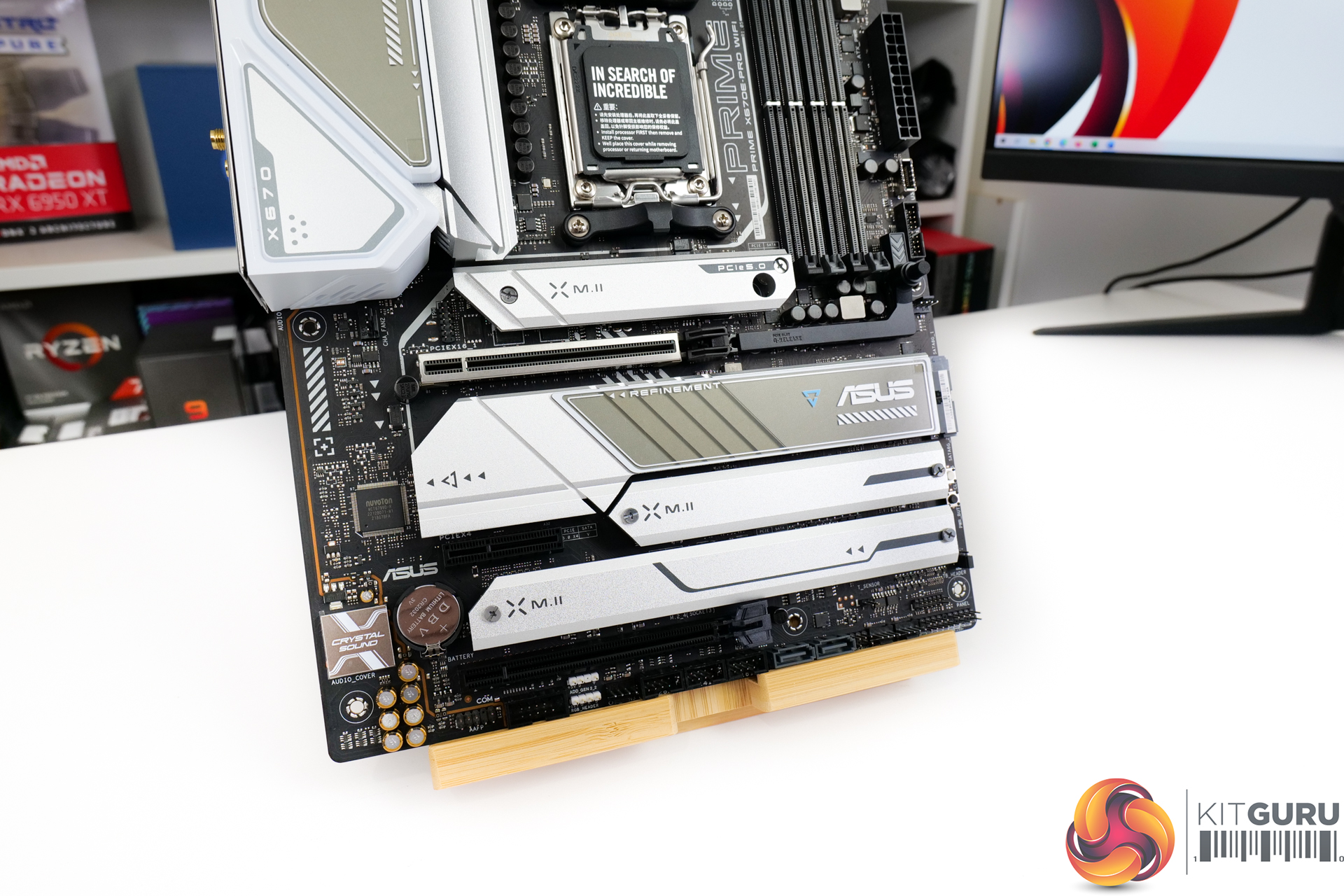 The primary PCIe 5.0 x16 slot is steel reinforced for both motherboards. One key difference, however, is that the Prime gets ASUS’ awesome Q-release button so that you can easily remove a fat graphics card from a fully built system. Additional PCIe connectivity comes from two PCIe 4.0 x4 electrical slots, one of which is full-sized for the physical connector.