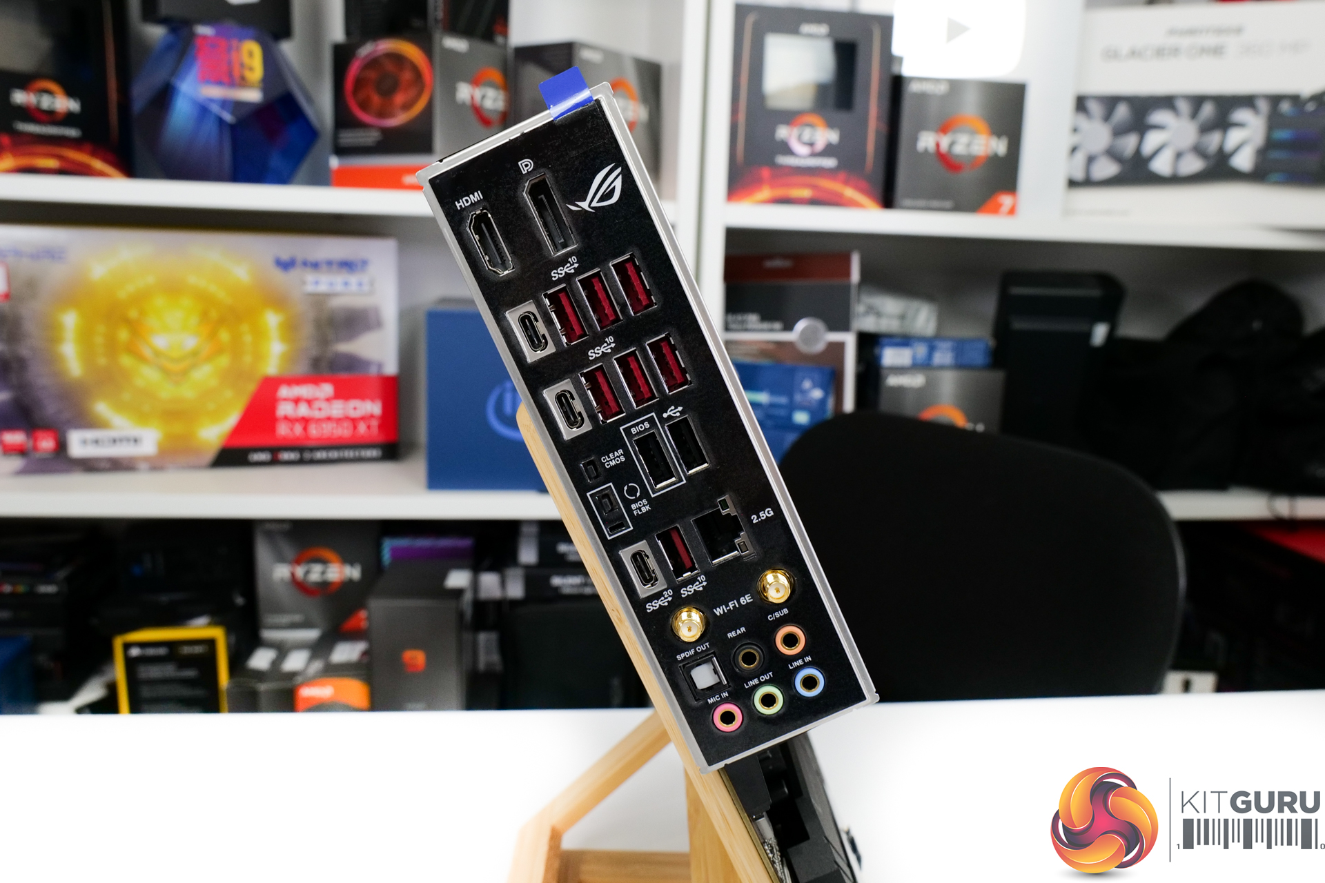 The densely-packed rear IO sports twelve total USB ports. These are one 20Gbps, nine 10Gbps, and two old-style USB 2.0. That’s an excellent selection, with the 20Gbps USB 3.2 Gen 2×2 running in Type-C form alongside two other 10Gbps Type-C ports.