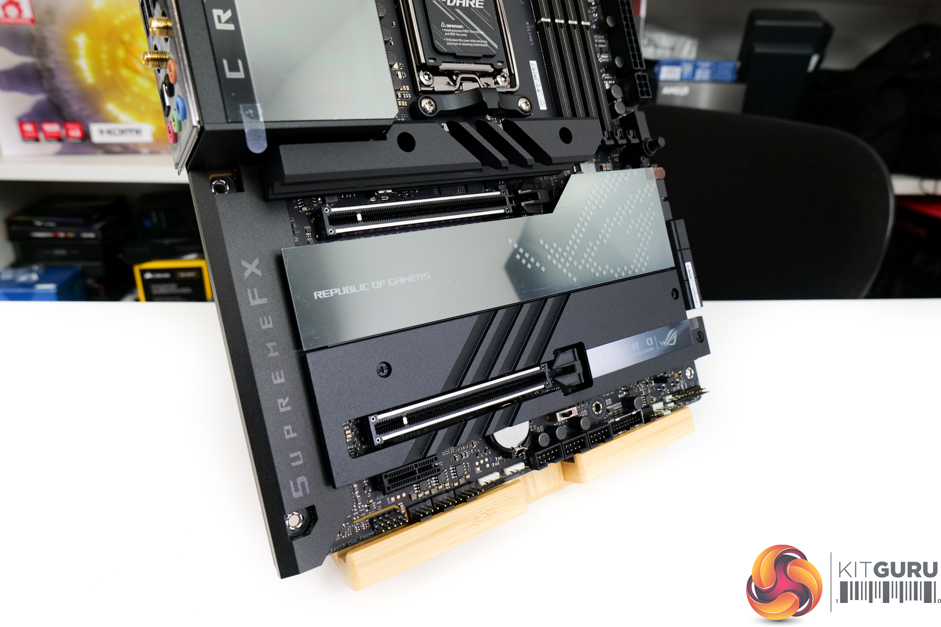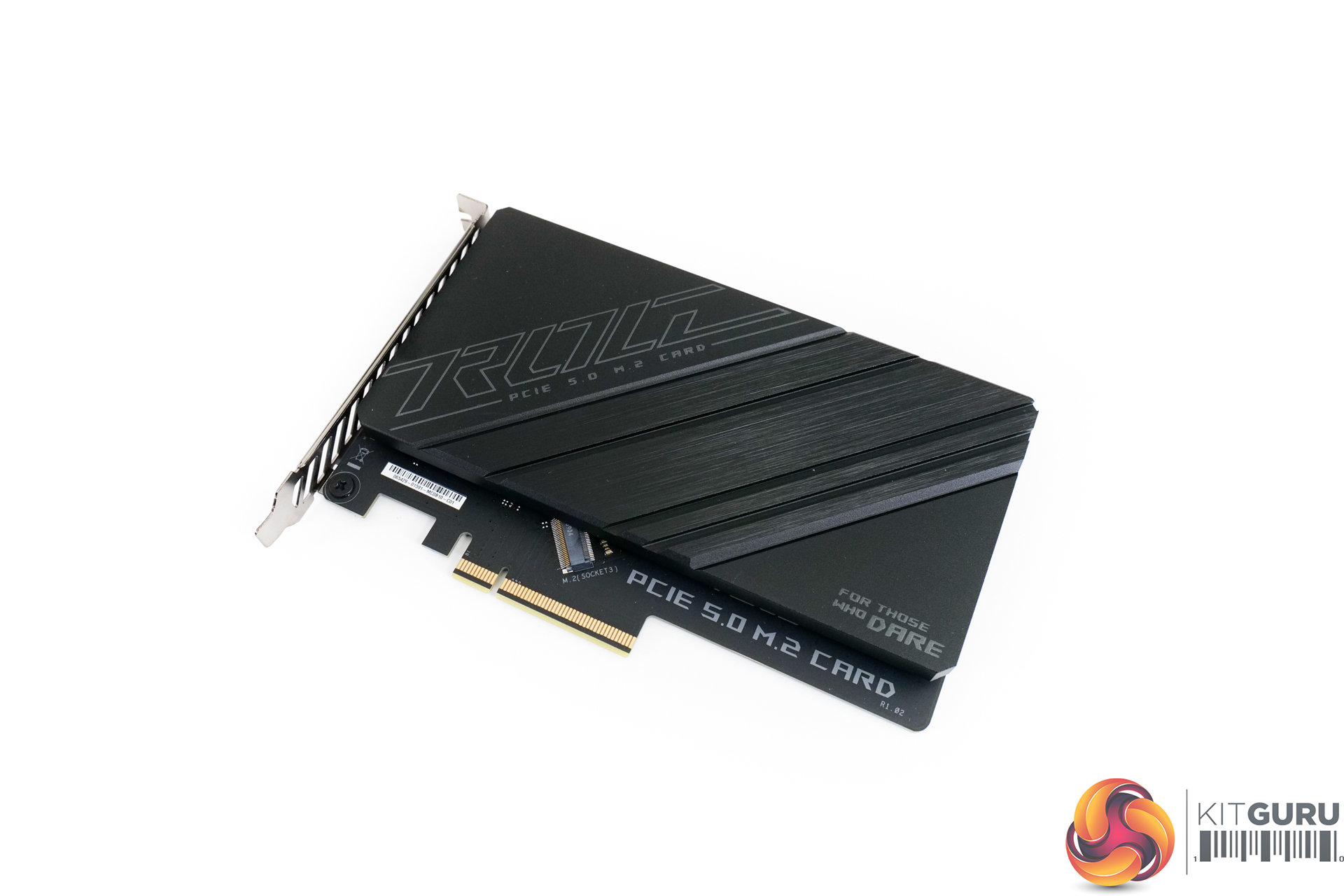 ASUS includes an ROG PCIe expansion card that can be used to house and cool a single Gen 5.0 M.2 drive. That is in addition to the four onboard M.2 slots, two of which are Gen 5 x4, with the other two being Gen 4 x4. Just look at that primary M.2 slot heatsink too – it is huge!