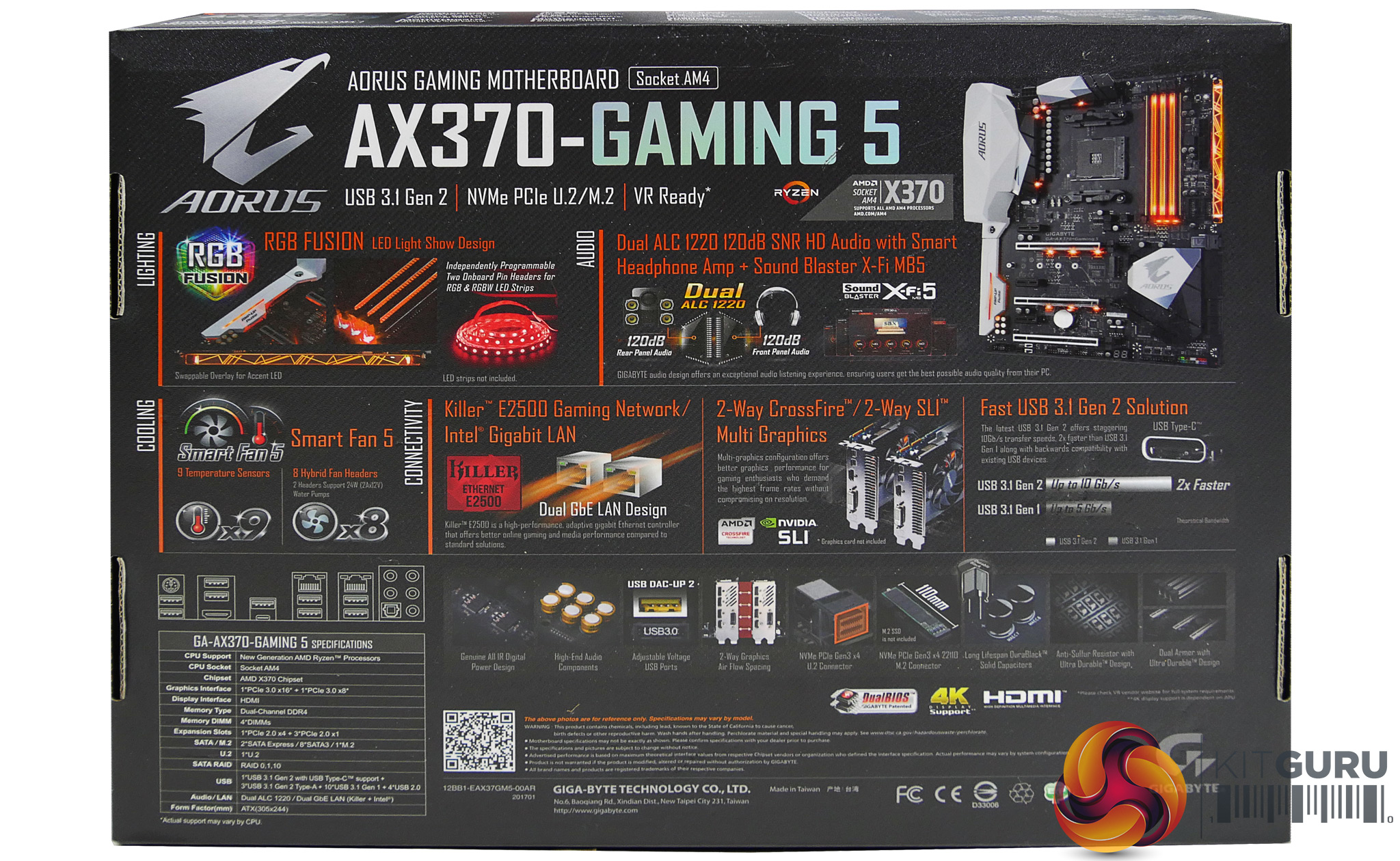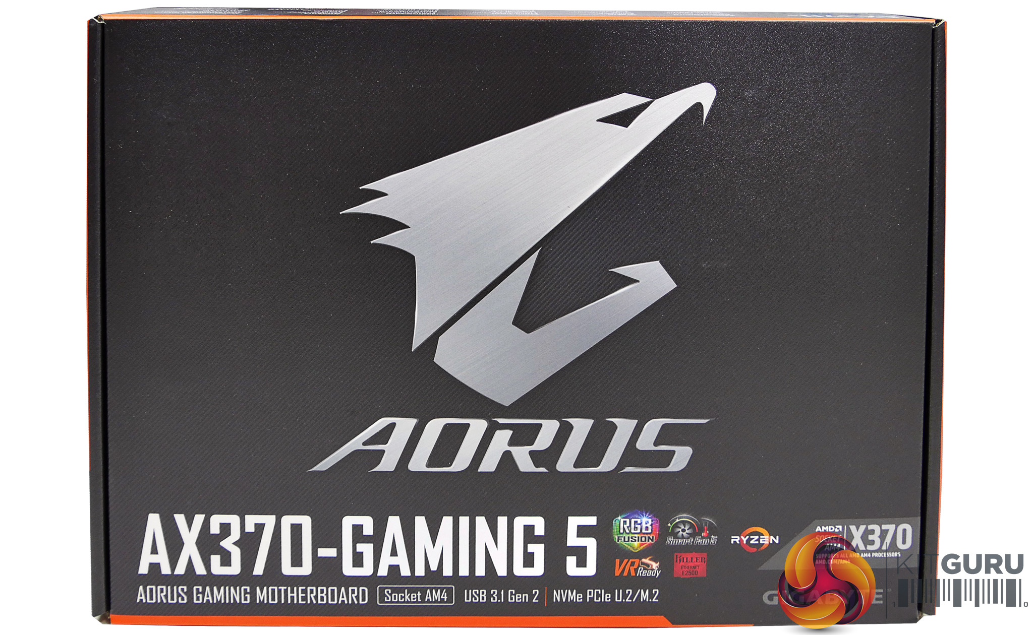 The Gigabyte Aorus AX370-Gaming 5 ships in packaging that is typical for this product line. A black box is contrasted by orange highlights and the Aorus eagle proudly takes centre stage on the front side. Key features relating to the motherboard are shown on the rear of the box.