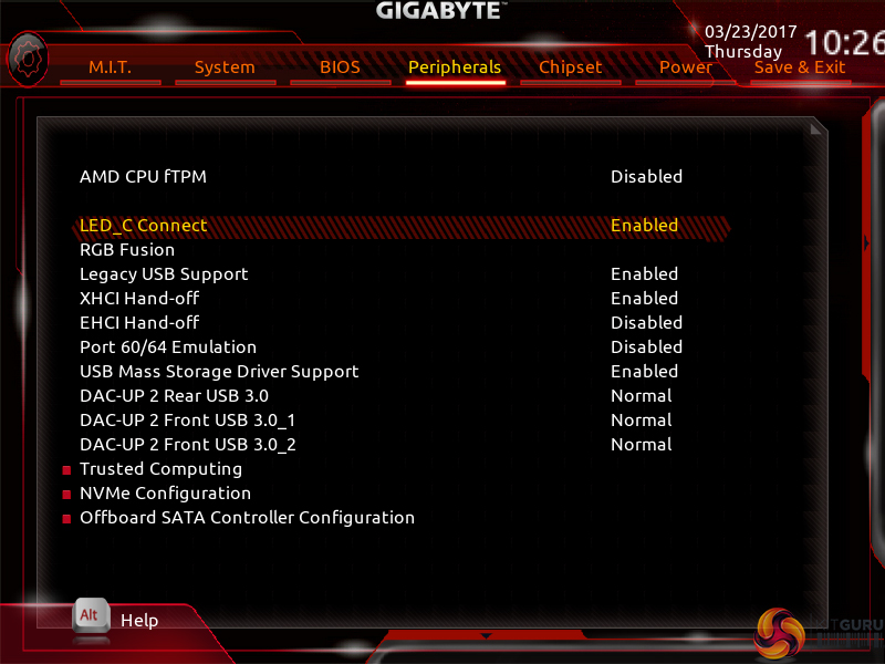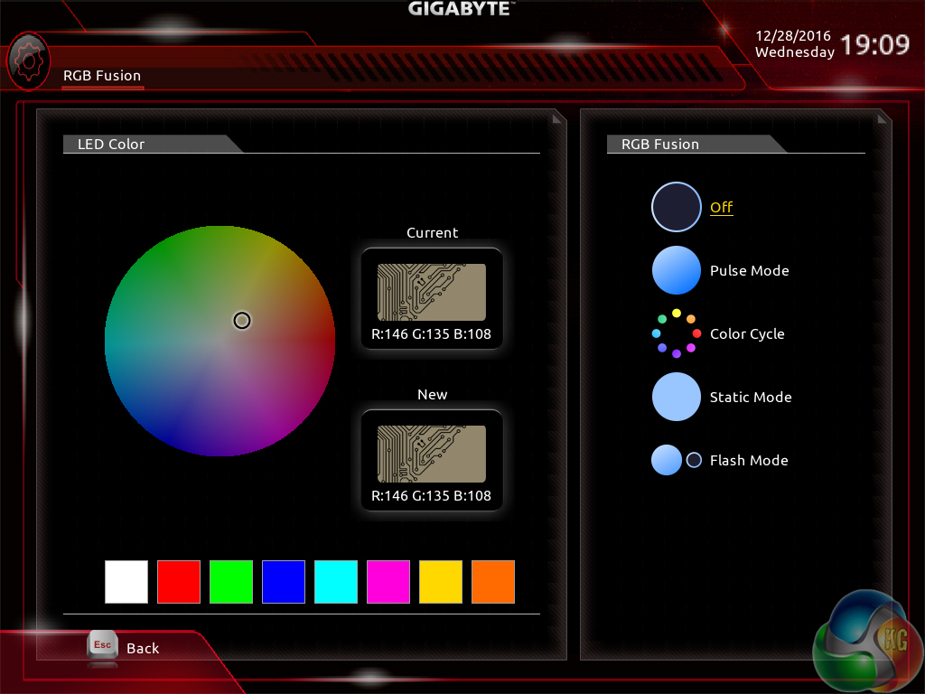 RGB Fusion is Gigabyte’s basic UEFI-based LED colour control tool. Colours can be adjusted in real time and the LED activation mode can be set, but that’s about it. There is a limit to how complex the tool can be given its residence inside the UEFI. The OS version has greater functionality.