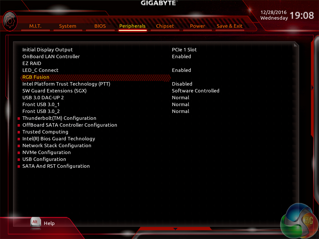 RGB Fusion is Gigabyte's basic UEFI-based LED colour control tool. Colours can be adjusted and the LED activation mode can be set, but that's about it. There is a limit to how complex the tool can be given its residence inside the UEFI and the OS version has greater functionality.