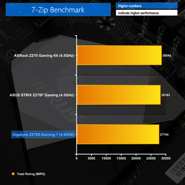 Memory bandwidth on Gigabyte's Z270 board is a little lower than that of the ASRock and ASUS competitors which makes for a similar picture with the 7-Zip result.