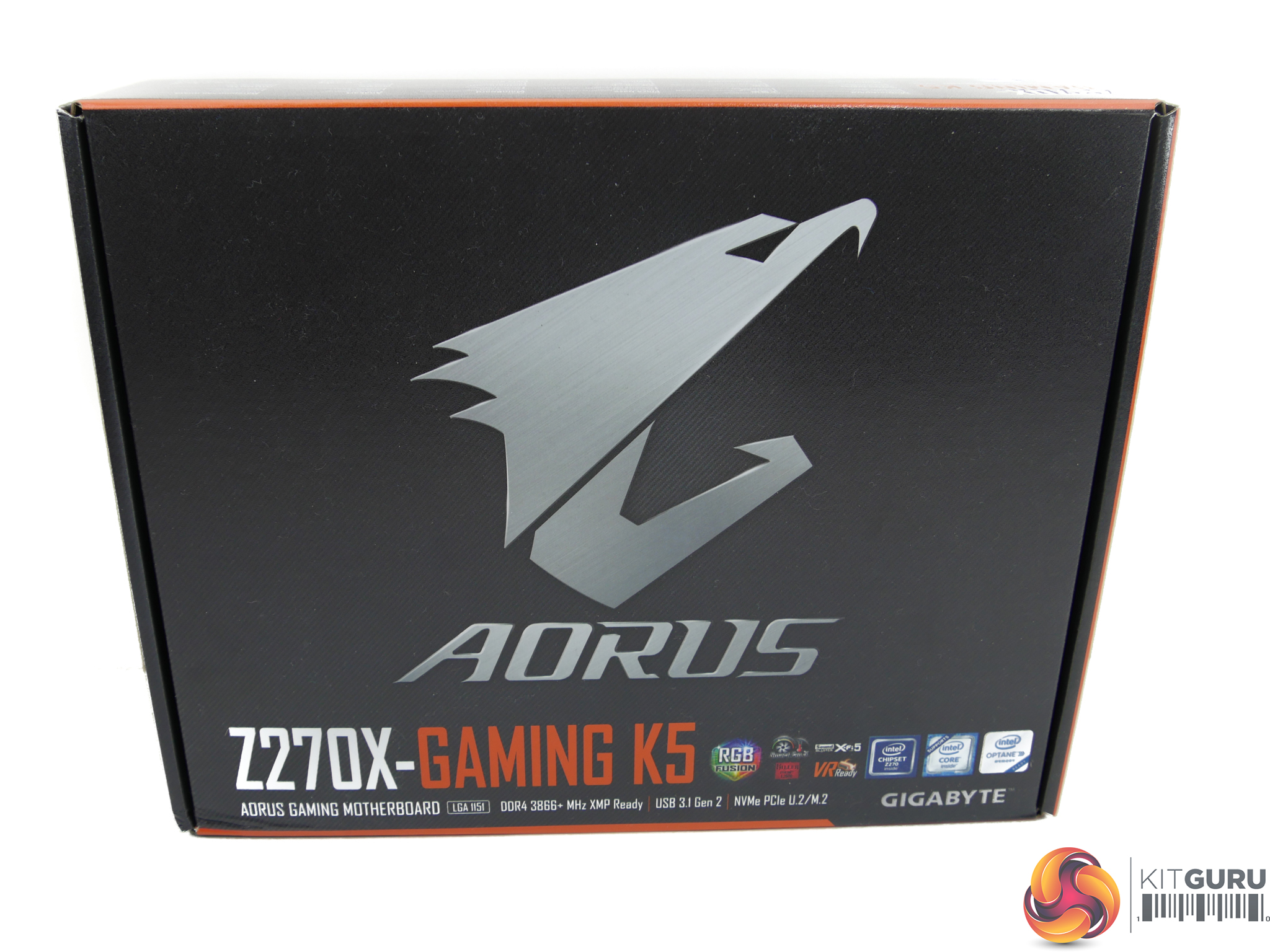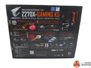 The Gigabyte Aorus Z270X-Gaming K5 ships in a black box that features the eagle branding logo on the front side and information relating to features on the rear.