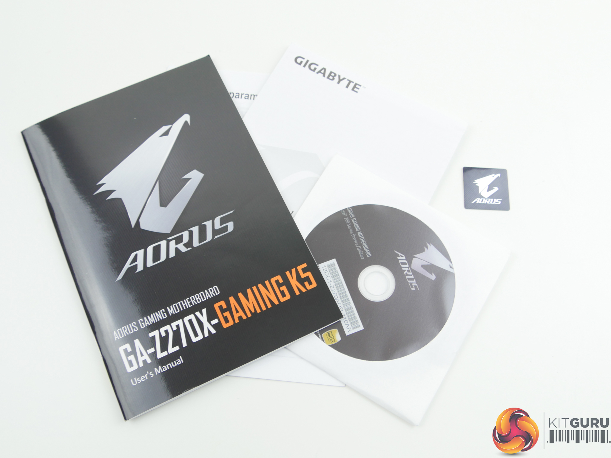 The usual set of documentation and drivers CD is accompanied by an Aorus case sticker.