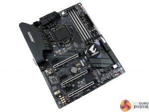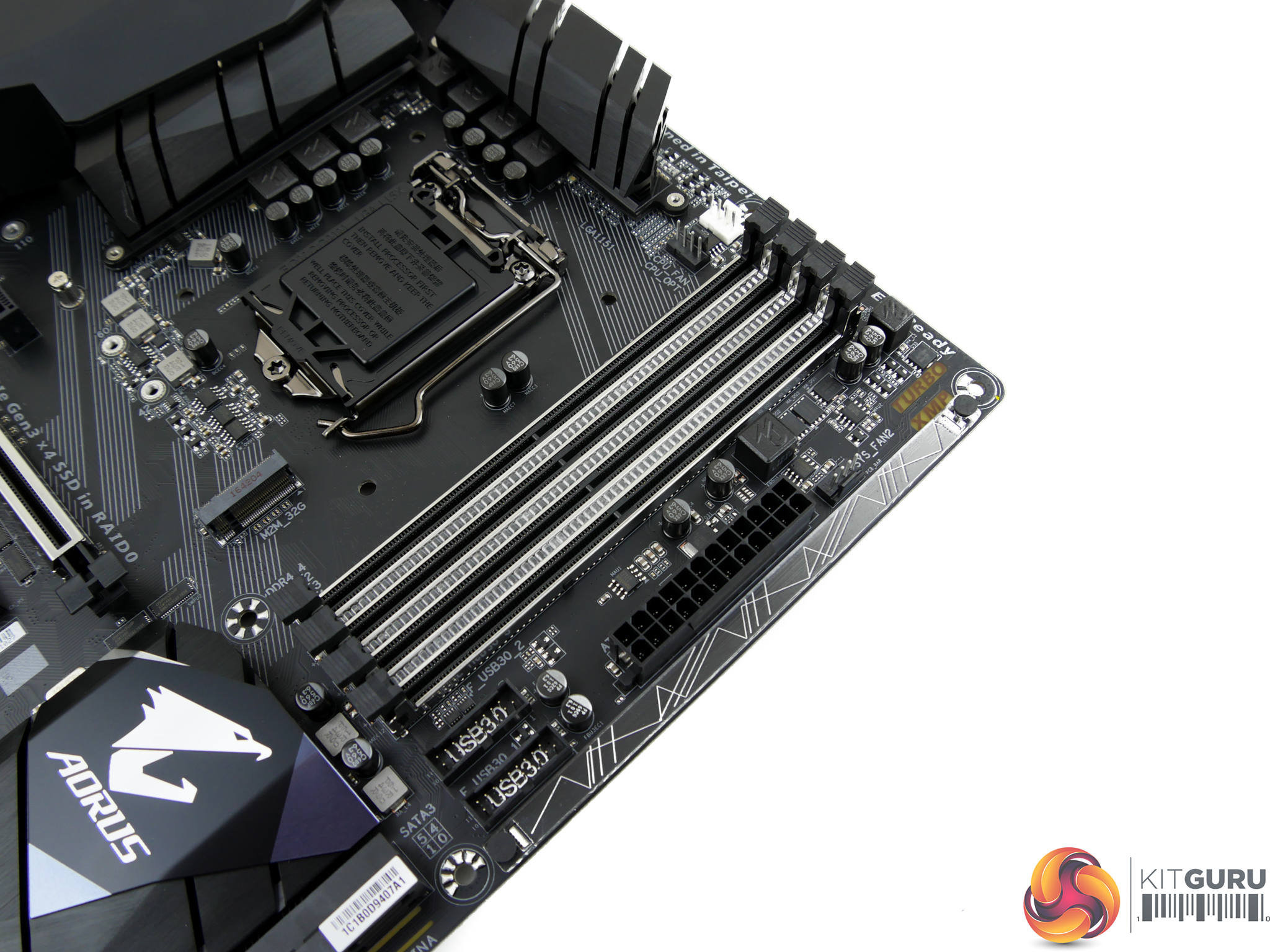 Gigabyte's Ultra Durable Armor PCIe slots are clearly visible with their stainless steel reinforcement designed to minimise GPU sag or slot damage. The same shielding approach is used for the DIMM slots which helps to minimise PCB flex during installation of memory modules.