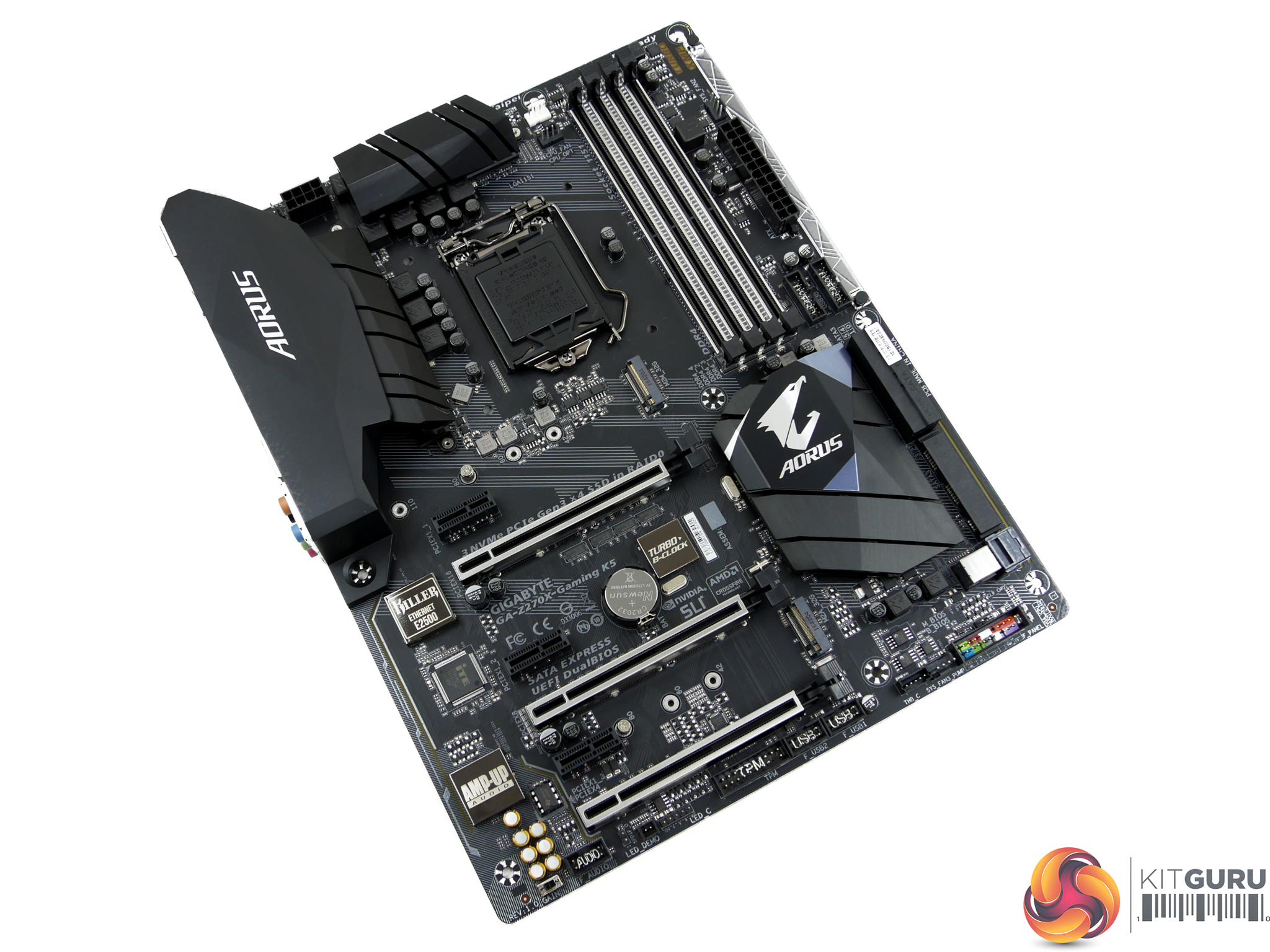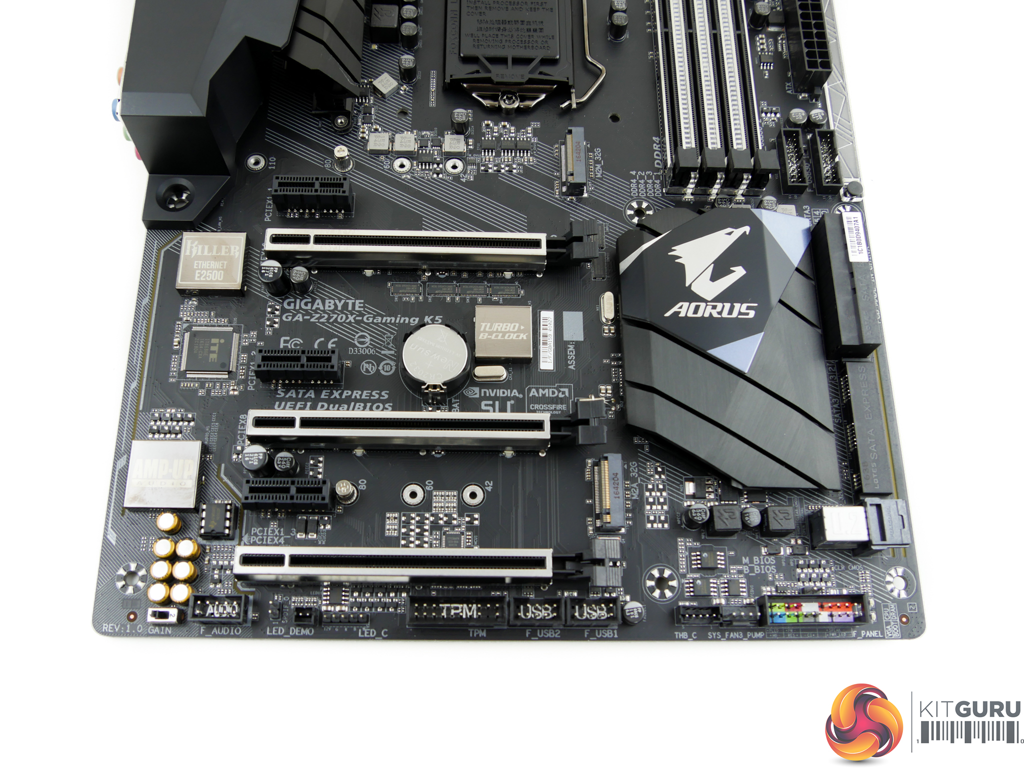 The Gigabyte Aorus Z270X-Gaming K5 uses primarily-black colouring, allowing the RGB LEDs to add unique styling tailored to individual preference. A solid black Aorus rear IO cover adds appeal to the board alongside the eye-catching Aorus chipset heatsink. Subjectively, this is a very aesthetically pleasing motherboard without even switching on the LEDs.
