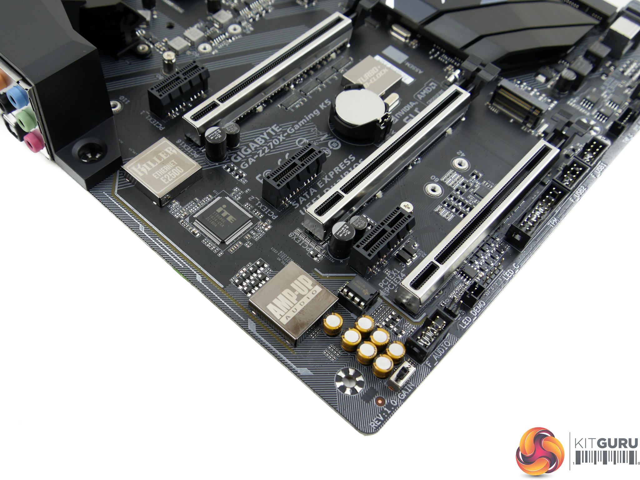 Gigabyte's AMP-UP audio system for the Aorus Z270X-Gaming K5 is based around the popular Realtek ALC1220 codec. Audio capacitors, codec shielding, and dedicated PCB traces aim to smooth out the signal and maintain its quality.