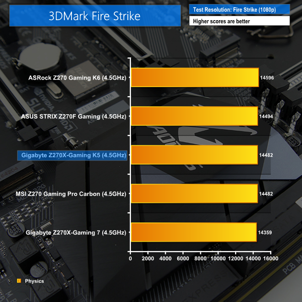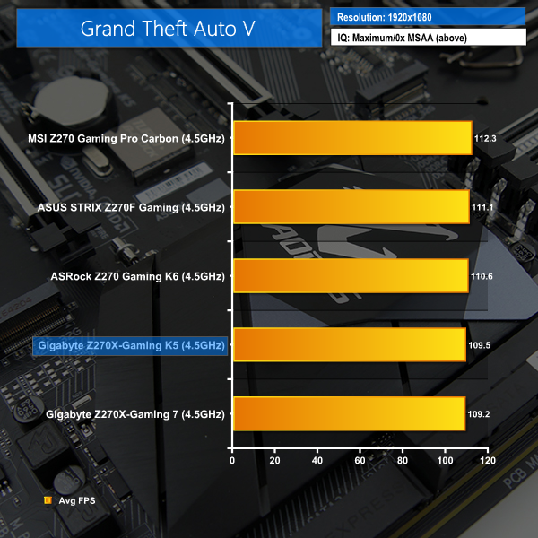 3DMark's Fire Strike test results in a decent score for the Gaming K5. However, this positivity is lessened when looking at Ashes of the Singularity and GTA V performance; the Aorus Z270X-Gaming K5 drops about 1-2% of the FPS performance in both of those titles compared to competing vendors' motherboards.