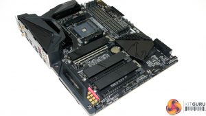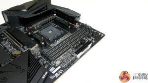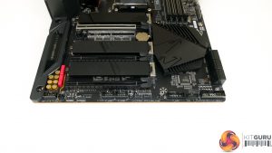 Four dual-latch DIMM slots house up to 128GB of DDR4 memory. These DIMM slots are steel reinforced to minimise PCB flex. Gigabyte highlights support for some 5GHz+ RAM kits according to the QVL.