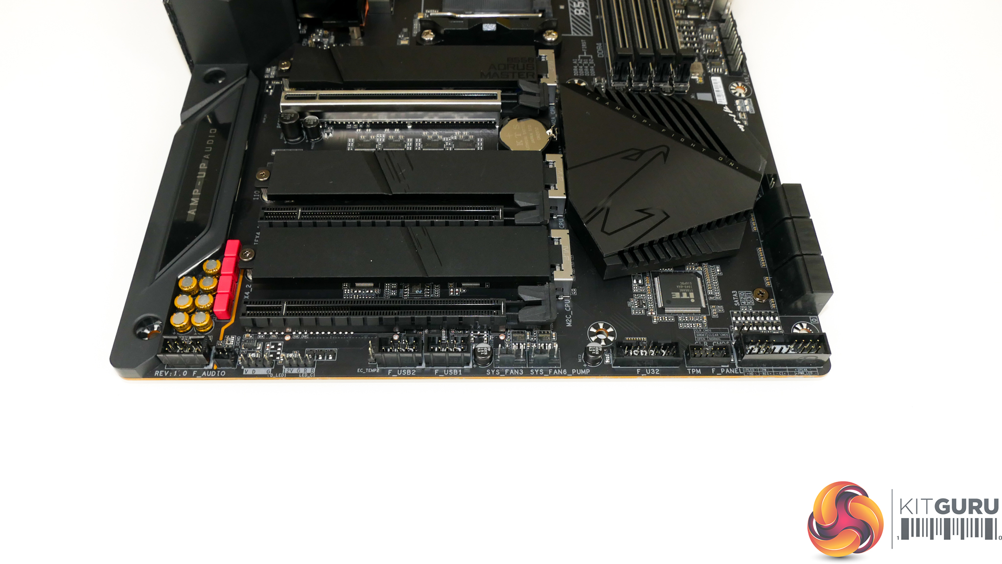 Gigabyte uses an excellent location for three top-edge fan connectors. They are all 4-pin and one is tucked away near the power connectors, making its trailing cable easy to hide. The pair of RGB headers are also in a smart location with a clear and easy route for hiding the cables.