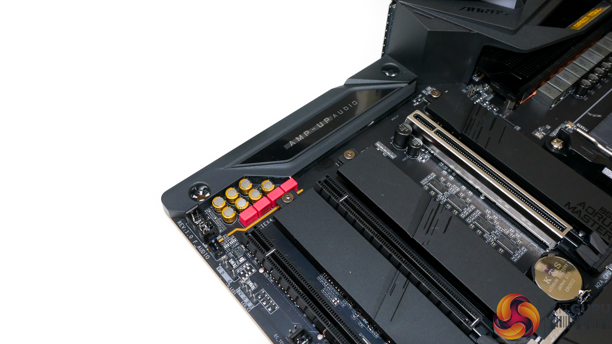 Gigabyte’s AMP-UP audio design is based around the Realtek ALC1220-VB audio codec. Nichicon and WIMA audio caps are used for signal filtering, and dedicated PCB tracks aim to minimise EMI.