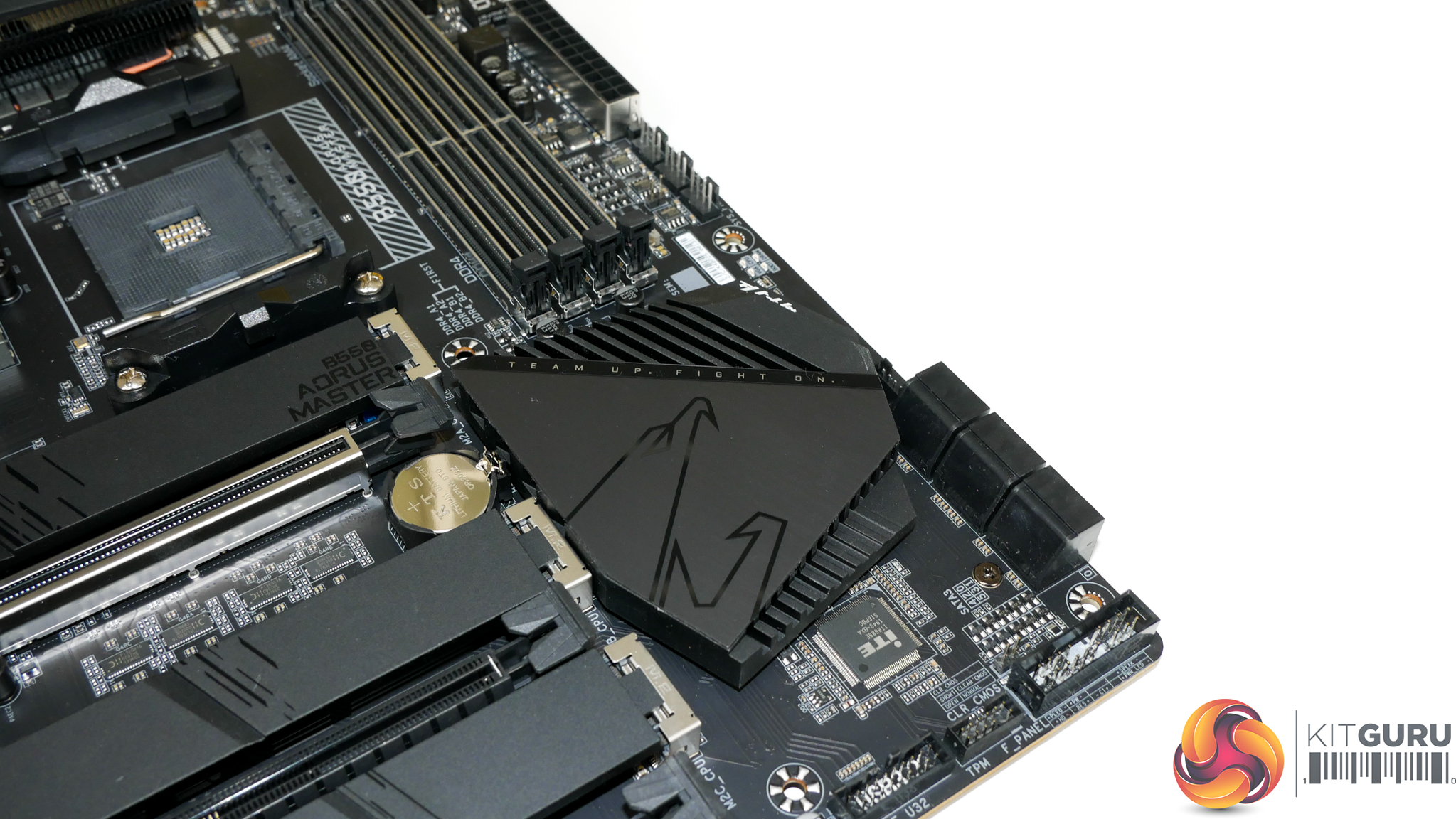 A solid block of metal is used to cool the B550 chipset. One of the biggest positives for B550 vs X570 is the lack of chipset fan, even though X570 is far superior in terms of PCIe connectivity and CPU-to-chipset bandwidth.
