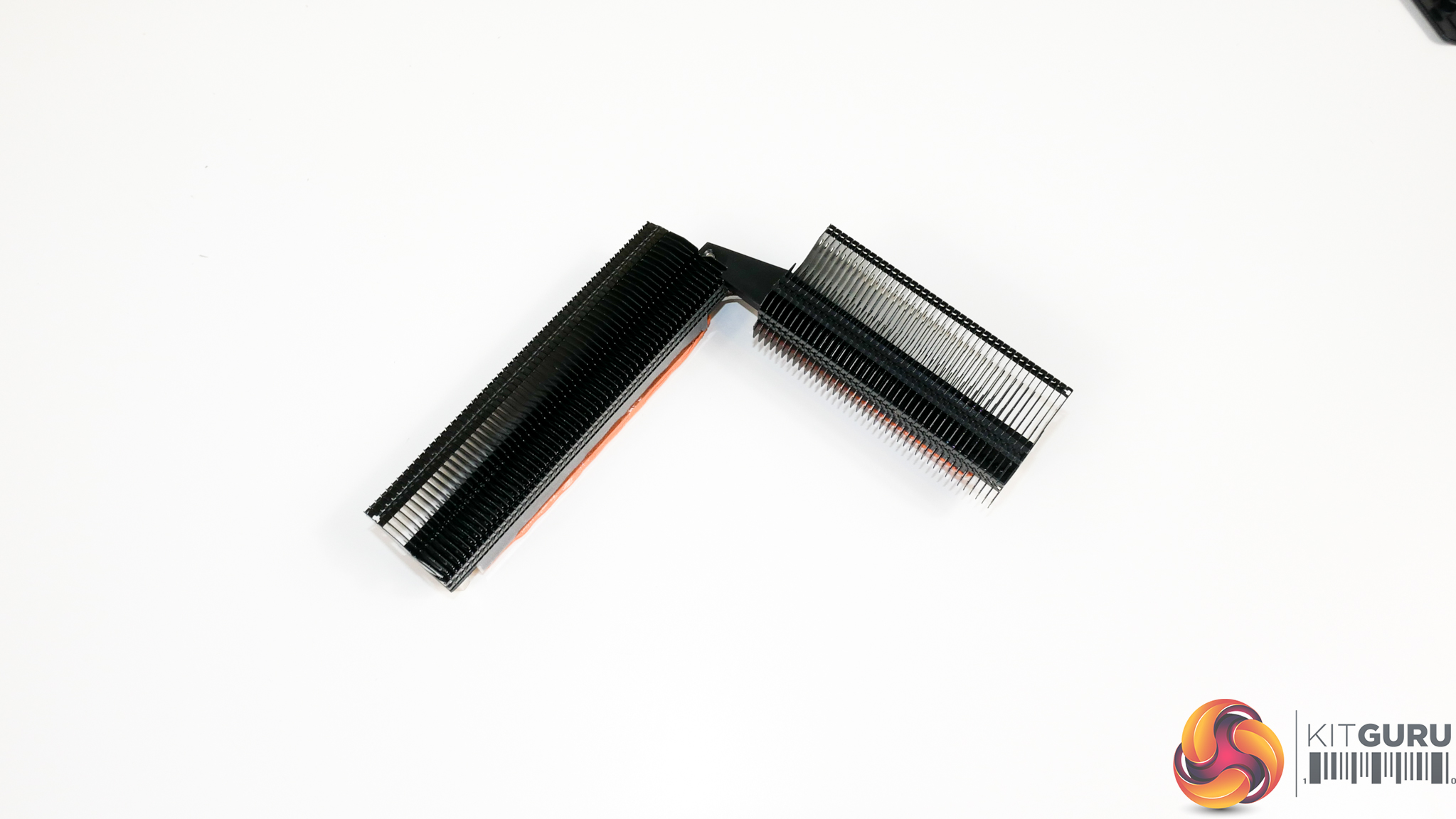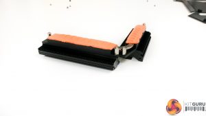 Gigabyte uses a proper finned heatsink design with the two arrays connected via a flattened heatpipe. The direct touch heatpipe is used with 7.5W/mK LAIRD thermal pads and mounted under high pressure with screws (not push pins).