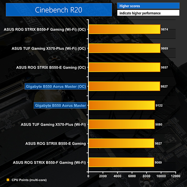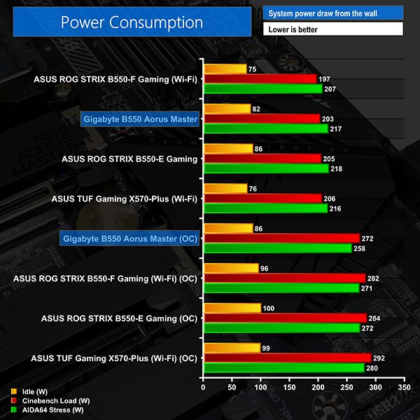 Overclocked numbers were better than those posted by the ASUS competitors. While this is a sign of Gigabyte’s superb VRM efficiency, it also highlights the benefit of clearer loadline calibration settings, as displayed by the B550 Aorus Master.