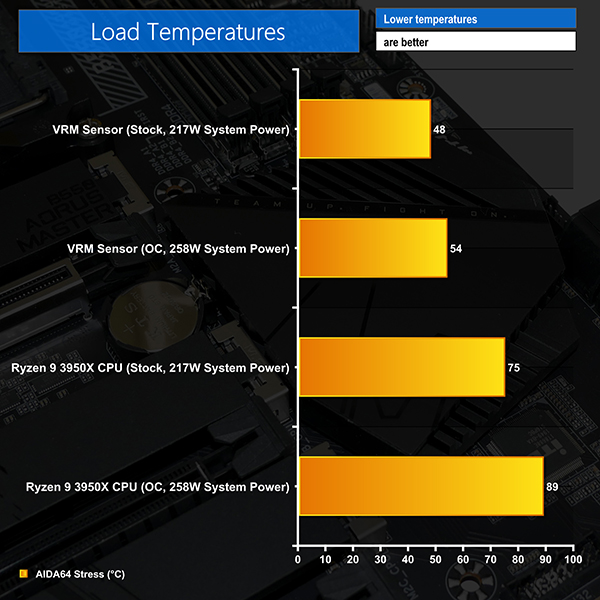 Stock-clocked CPU temperatures were absolutely fine thanks to Gigabyte’s reasonable voltage and power reporting configuration. We also saw that the high-performance VRM and finned heatsink had absolutely no problem handling the sub-220W system load applied by a Ryzen 9 3950X.