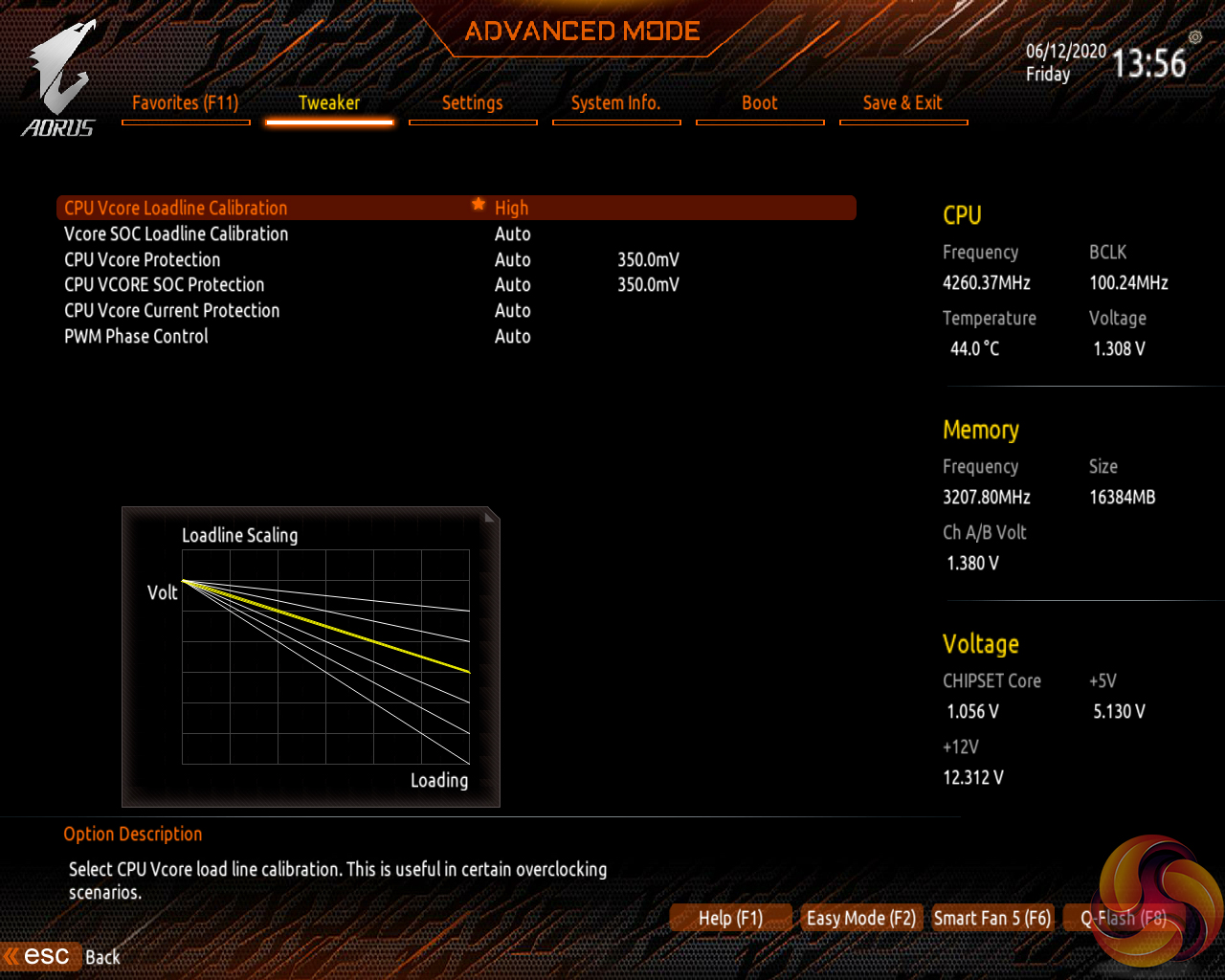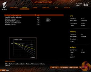 Overclocking with the Gigabyte B550 Aorus Master is fairly quick and easy thanks to Gigabyte’s simple UEFI and clear loadline calibration behaviour chart.