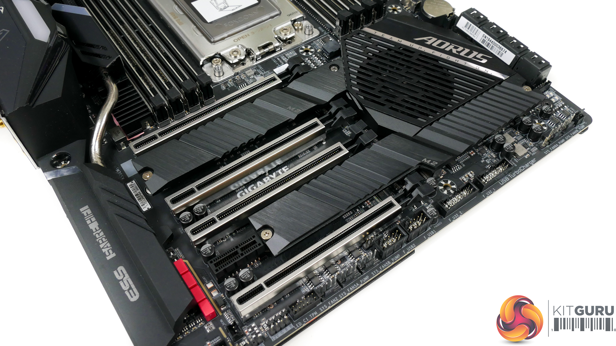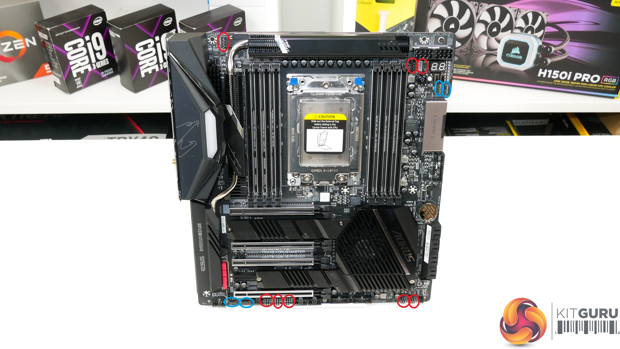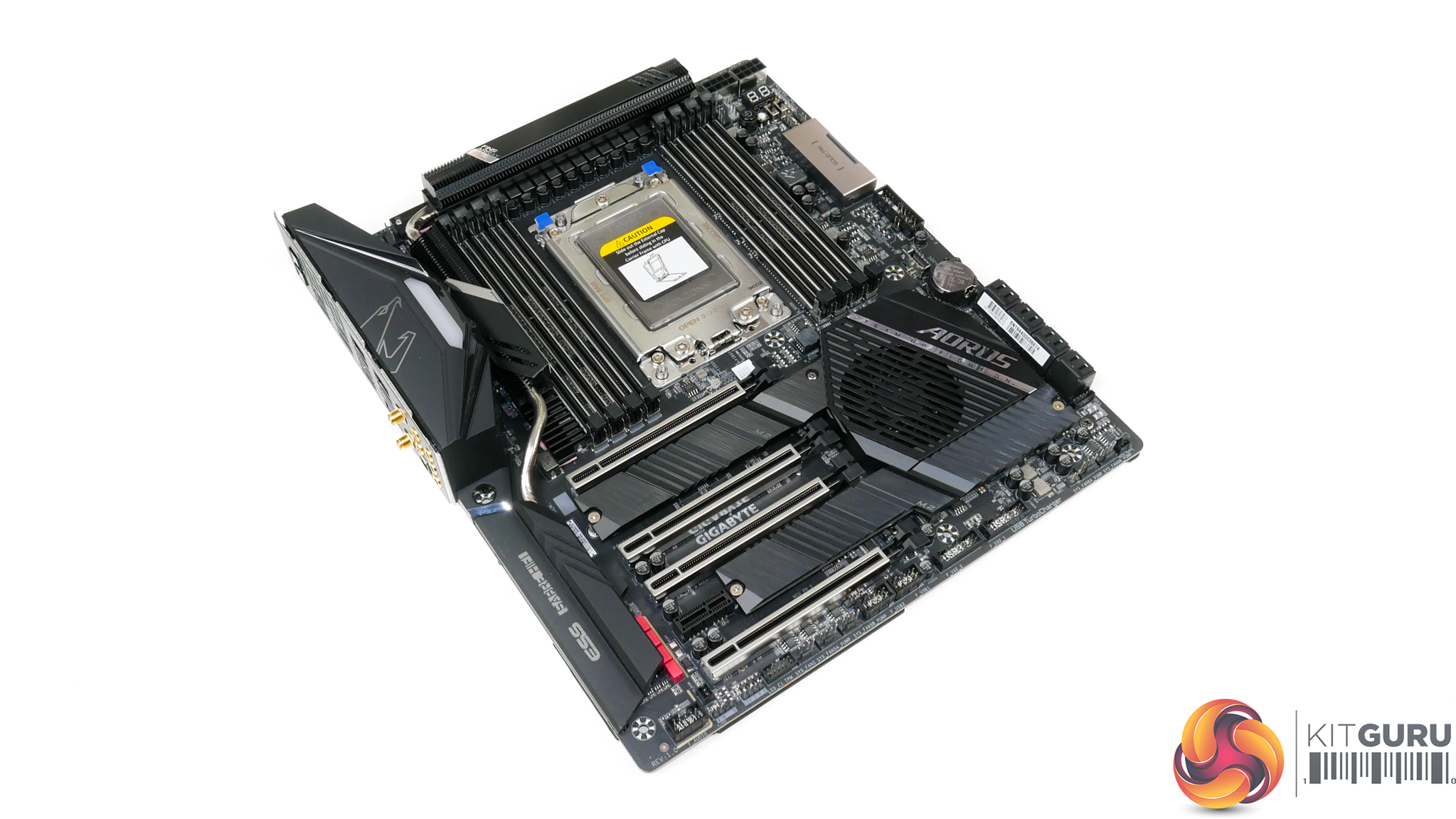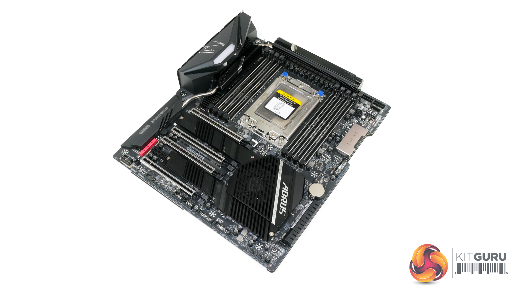 Evident is the TRX40 Aorus Master’s widened Extended-ATX sizing that makes chassis selection more challenging but certainly not as difficult as the longer XL-ATX form factor.