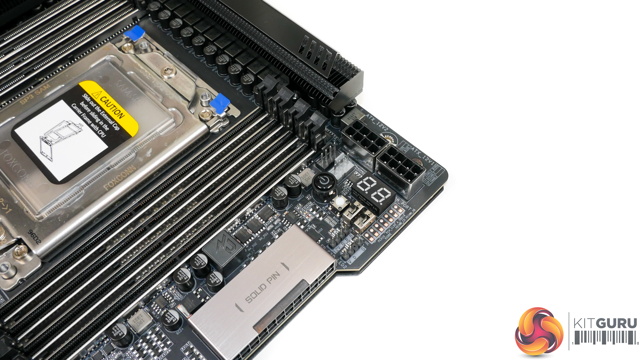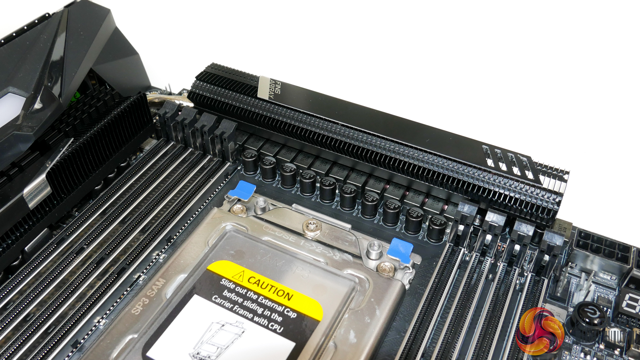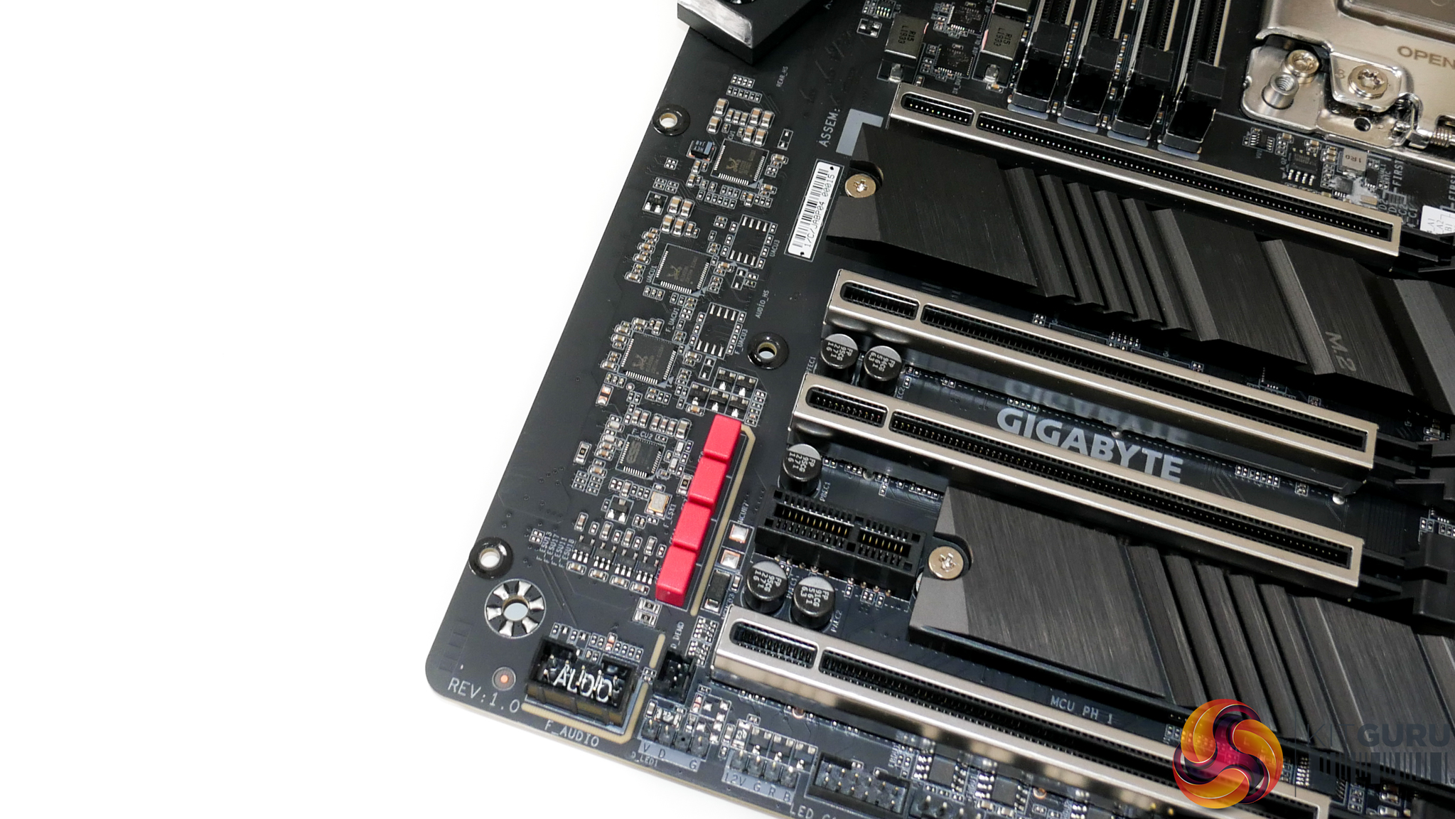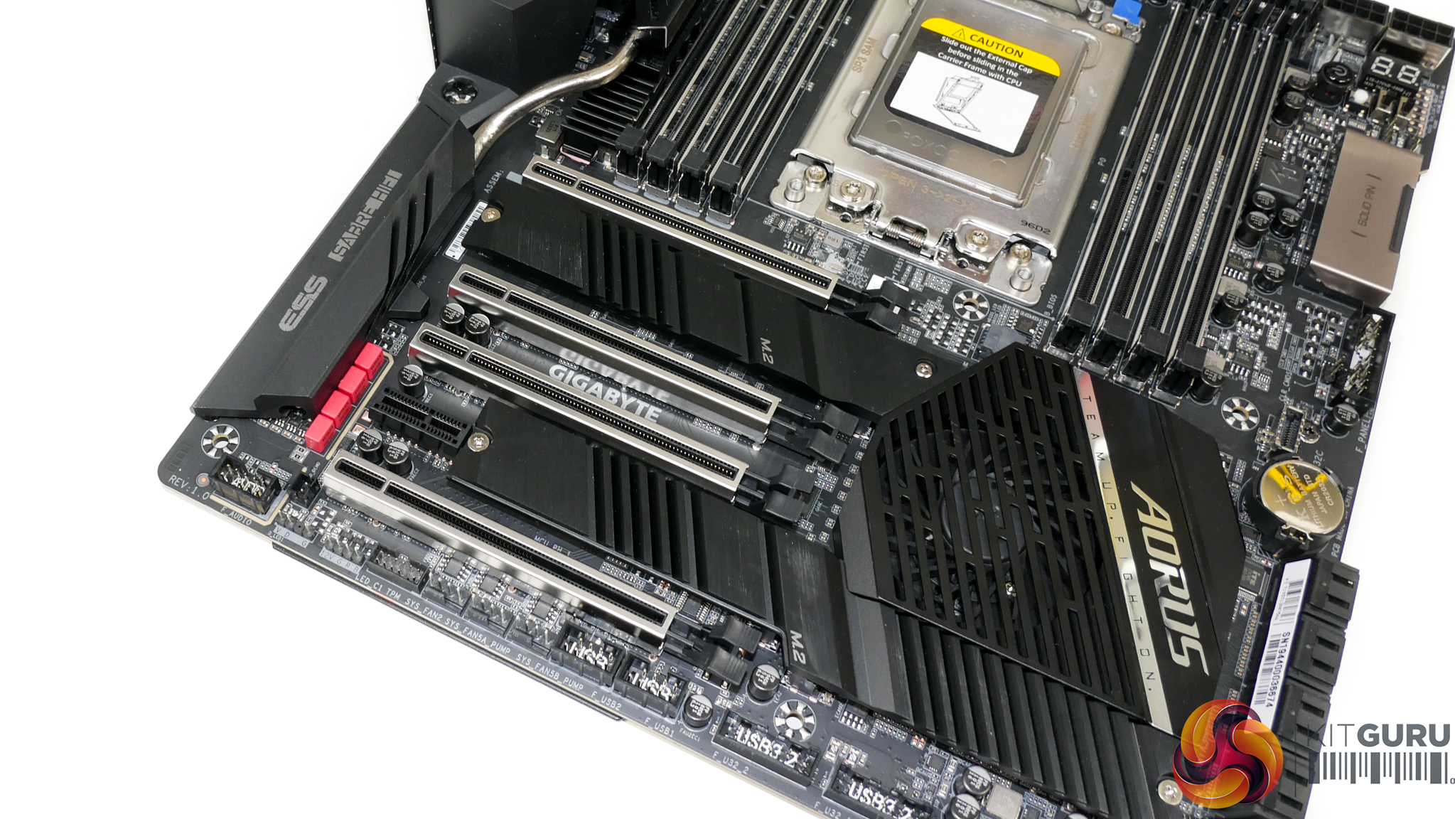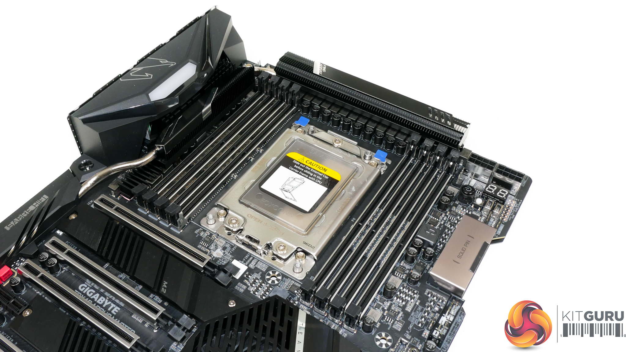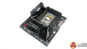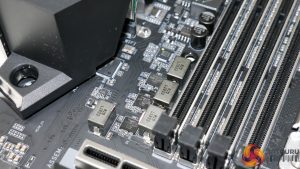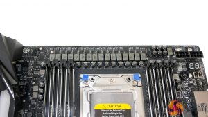 Vertical positioning of the CPU socket and DIMM slots means that the first PCIe slot location is infringed upon. The benefit of this design decision is that it allows Gigabyte to provision more space above the CPU socket for the VRM components and cooling.