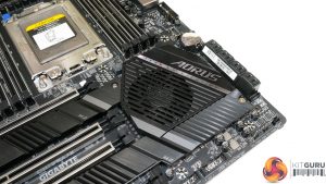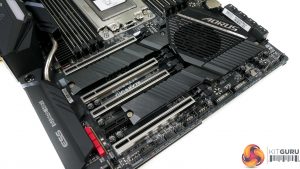 As is the norm for TRX40 motherboards, eight DDR4 DIMM slots are positioned either side of the giant sTRX4 CPU socket. Gigabyte quotes support for non-ECC memory up to 256GB using currently available 32GB DIMMs. ECC memory support is also stated, with Gigabyte’s QVL outlining compatibility with some Crucial (Micron) and V-Color (SK Hynix) modules.