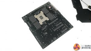 A dark black aluminium backplate encompasses most of the motherboard’s rear side. This rear brace certainly adds structural rigidity to the motherboard, and that is useful when installing a heavy CPU cooler and multiple graphics cards.