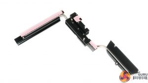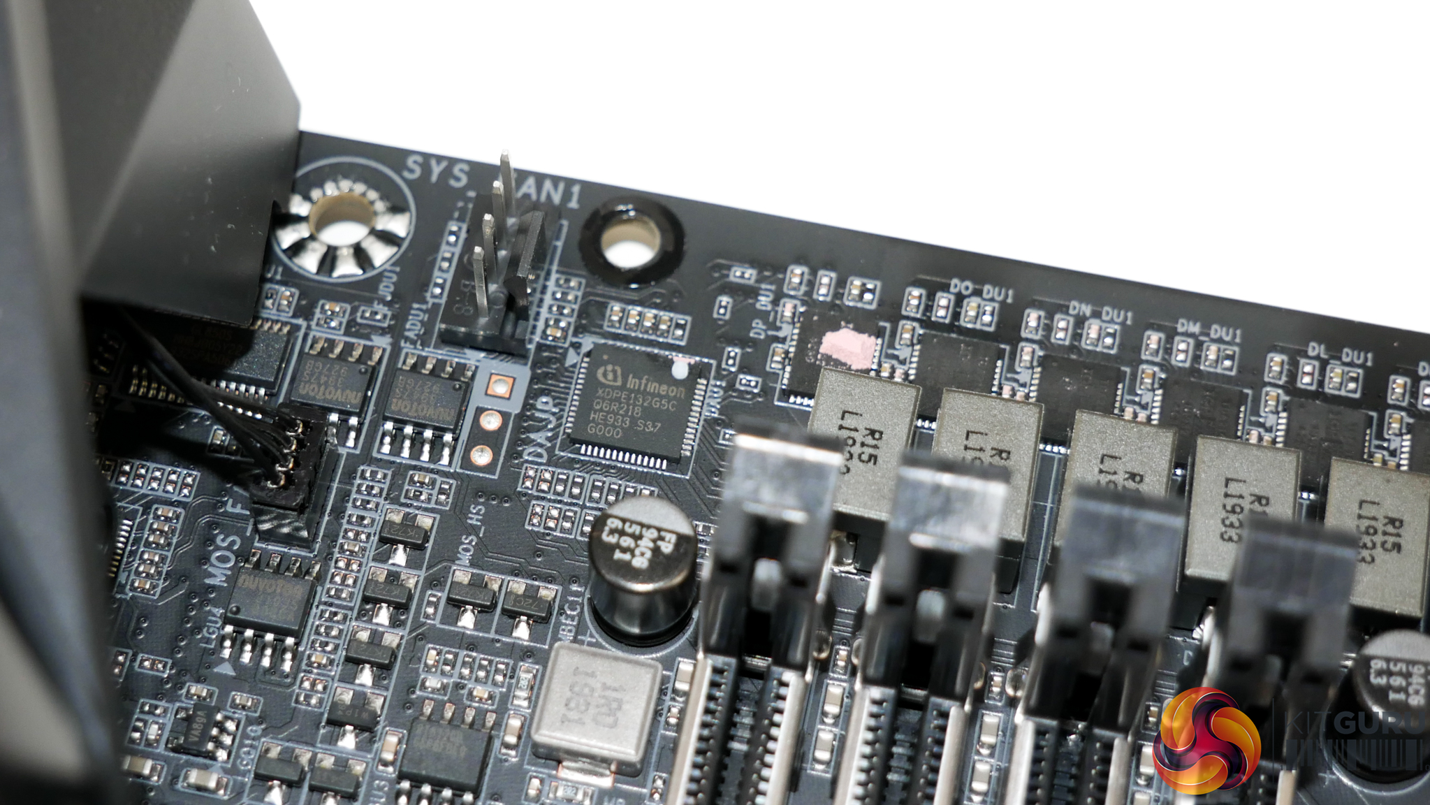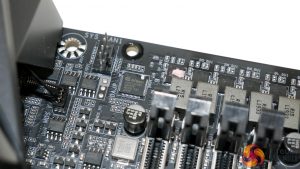 The ‘NanoCarbon-coated’ aluminium backplate makes clear contact with the underside of the power delivery area via thick thermal pads. This allows for heat soaking through the PCB to be transferred to the sizeable piece of metal and therefore dissipated over a greater surface area than the concentrated PCB hotspot.
