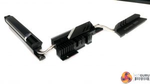 The primary MOSFET heatsink is mounted on the top side of the configuration and is connected via heatpipe to the secondary heatsink and the thermal block that stretches down to the motherboard’s bottom-left region.