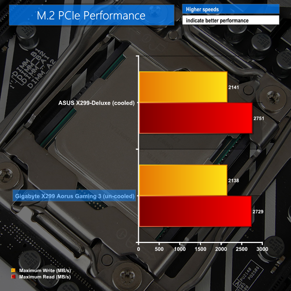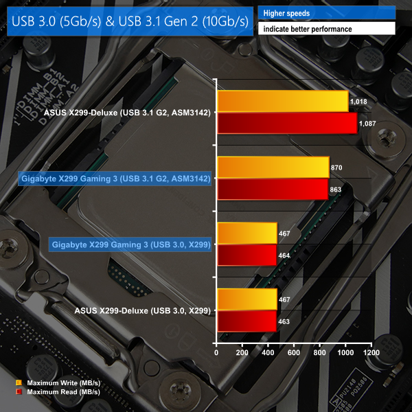 Despite using the same ASMedia-based USB 3.1 Gen 2 10Gbps solution, the Gigabyte board could not keep pace with ASUS' higher-cost offering. It looks like USB 3.1 performance is currently suffering due to early platform issues.