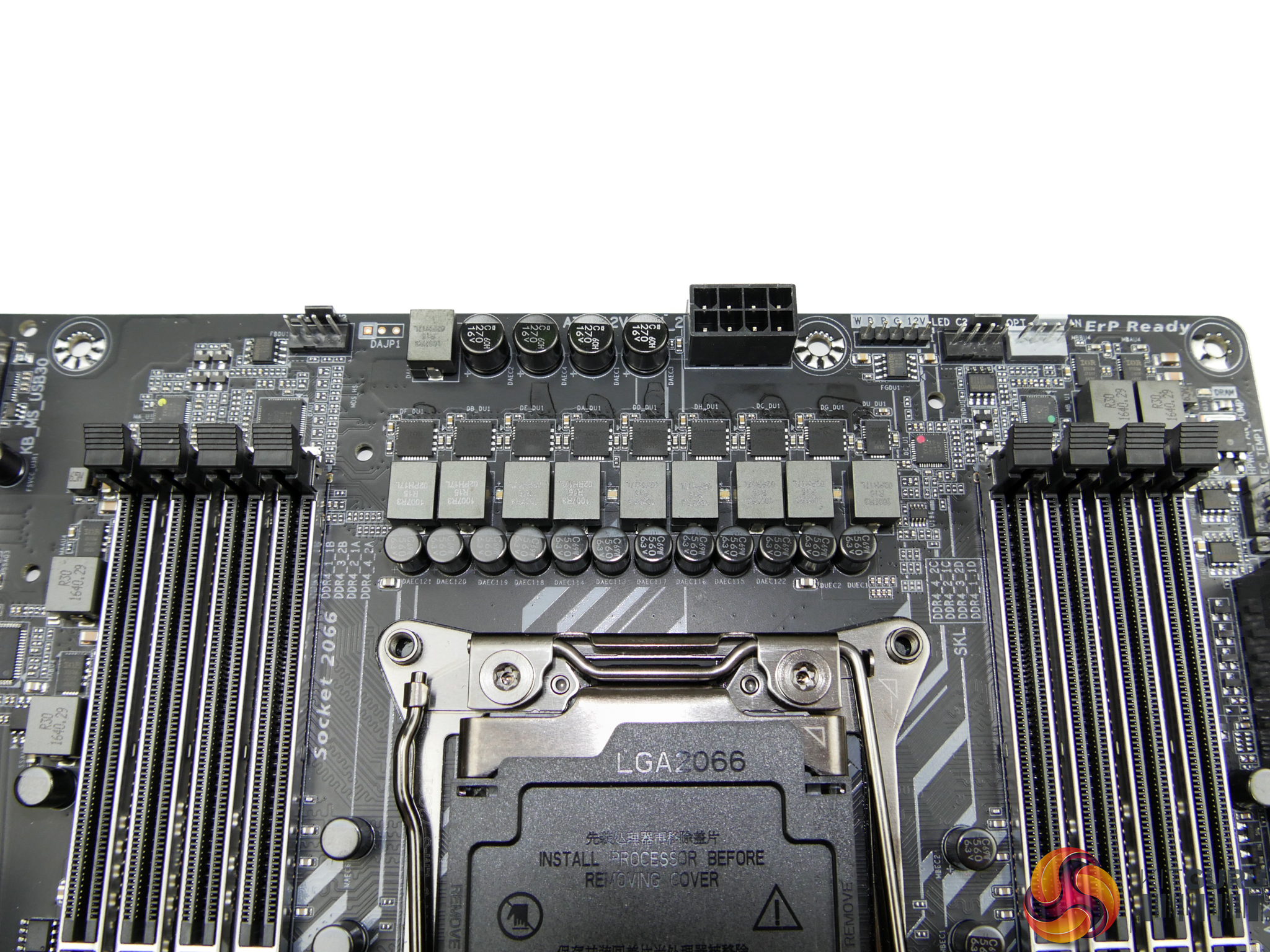 Four DIMM slots are positioned either side of the LGA 2066 socket, making this motherboard quad-channel memory capable with a Skylake-X CPU. Gigabyte conveniently highlights which slots should be used with a Kaby Lake-X CPU and its dual-channel memory support.