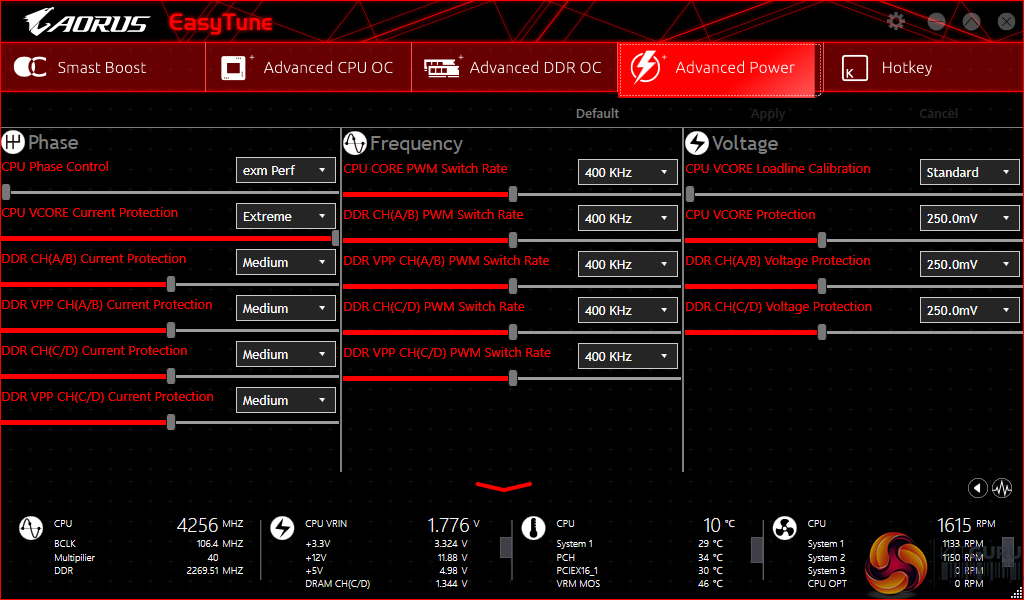 The Advanced section gives more LED control, allowing users to adjust the lighting colour and behaviour for the board’s numerous individual zones (and RGB header). The RGB strips can be set as a different colour to the motherboard. Three individual LED profiles can be saved and they can be exported/imported to share with friends or for backup purposes. RGB Fusion can control the LED profiles of partnering hardware such as an RGB-enabled Aorus graphics card.
