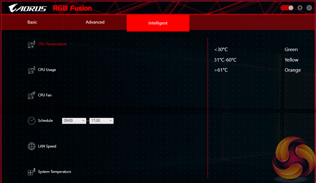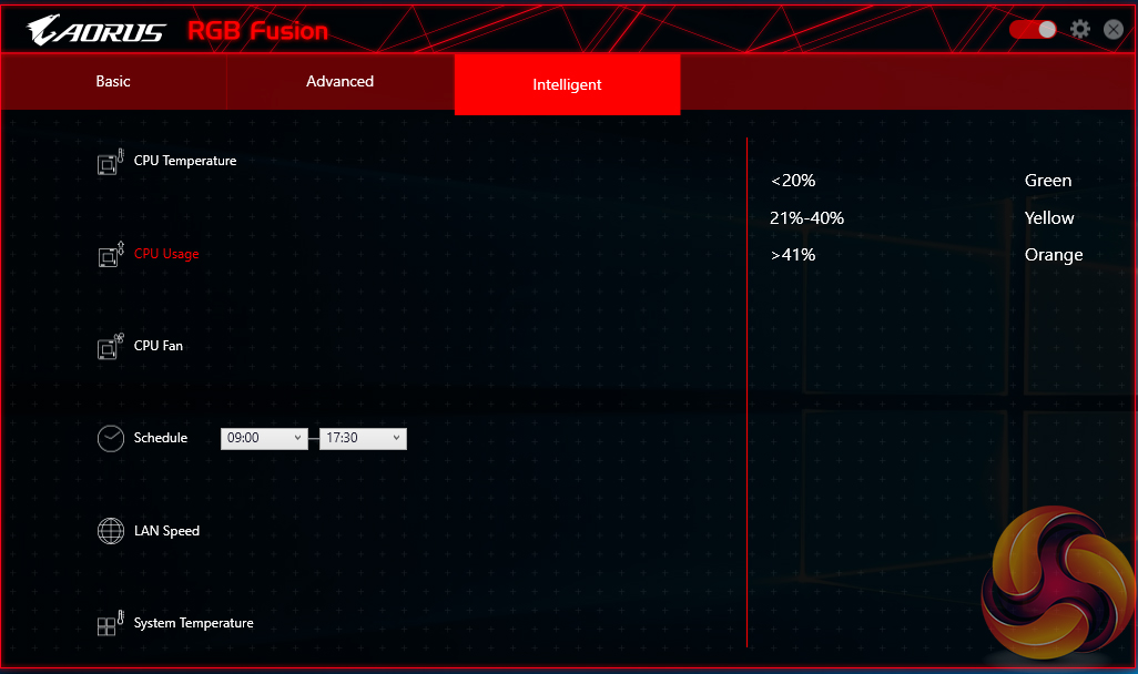 RGB Fusion is Gigabyte’s in-depth LED control application. The Basic tab can be used to activate different LED operation modes and tweak the RGB behaviour. I was particularly fond of the Intelligent mode which adjusts the LED colour profile based on statistics such as the CPU temperature or load, the LAN speed, or even a time schedule.