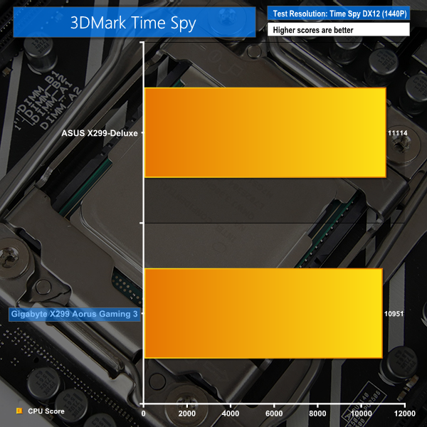 3DMark is a multi-platform hardware benchmark designed to test varying resolutions and detail levels of 3D gaming performance. We run the Time Spy benchmark, which is indicative of high-end 1440p PC Gaming with the DX12 API.