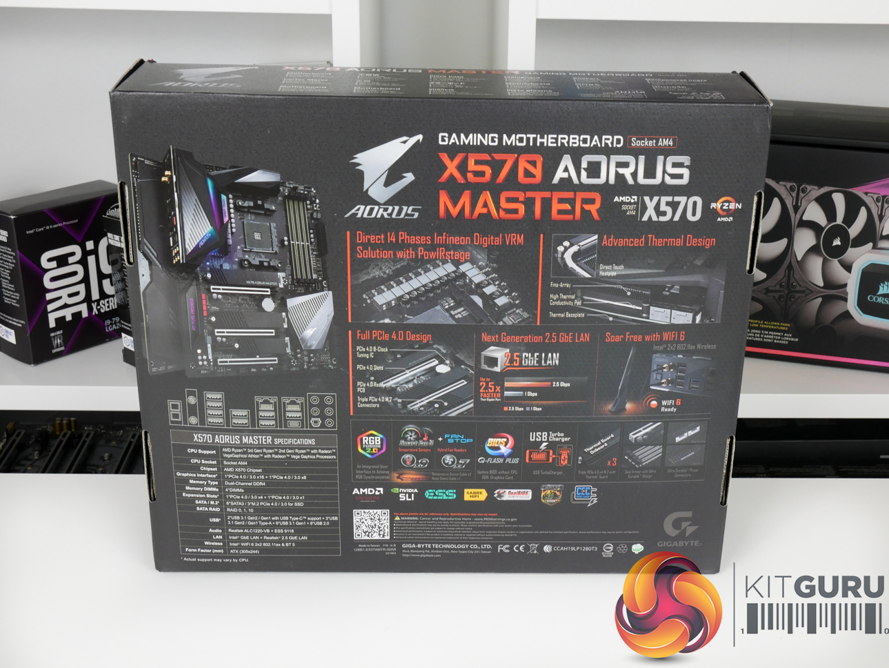 Gigabyte ships the Aorus X570 Master in a dark box that features plenty of product information.