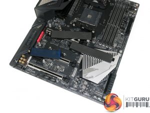 The uppermost slot gets its PCIe 4.0 x4 or SATA connection from the AMD CPU, while the remaining two are fed by the X570 chipset. As previously highlighted, you’ll want to use the top slot first, then the second, then the third as the lowermost one shares bandwidth with two SATA ports. All three ports could be used together for an impressive RAID array.