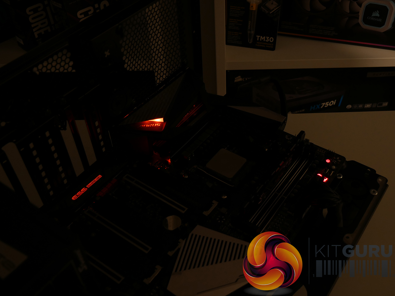 Small touches of RGB lighting are found on the rear IO shroud and the bottom-left audio area. Gigabyte keeps the amount of RGB lighting minimalistic thus encouraging users to purchase their own hardware that can be synced.