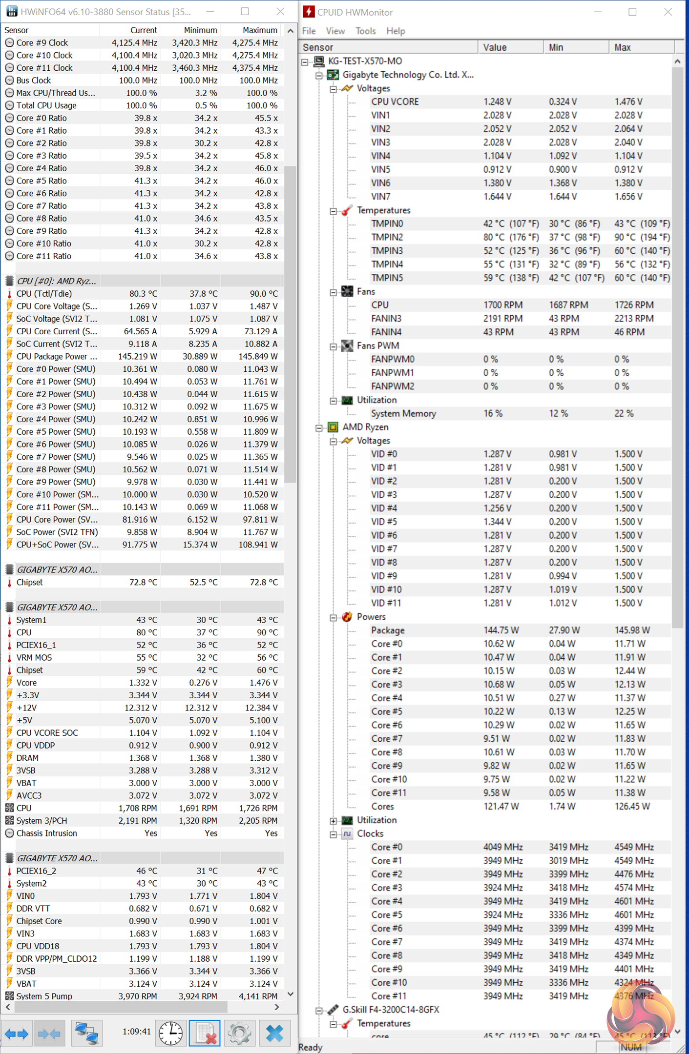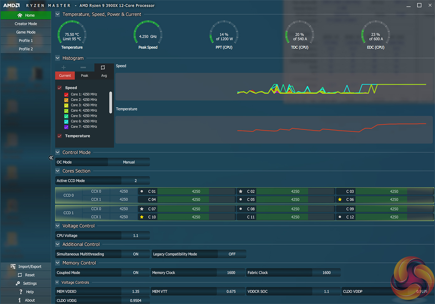 We were able to hit a stable frequency of 4250MHz using 1.35V. The Gigabyte X570 Aorus Master motherboard forced us to apply the High load-line calibration setting in order to keep close to 1.35V under load.