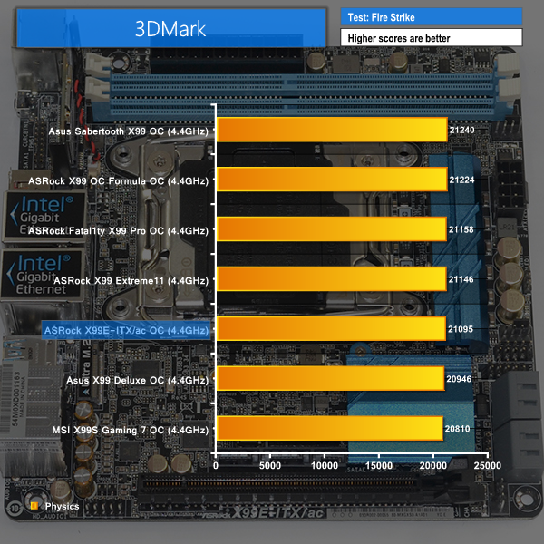 As a performance comparison, we have included the overclocked results from seven other X99 motherboards. The maximum overclocked configuration achieved with each board was a 4.4GHz processor frequency and 2666MHz memory speed (2400MHz for ASRock's X99E-ITX/ac).