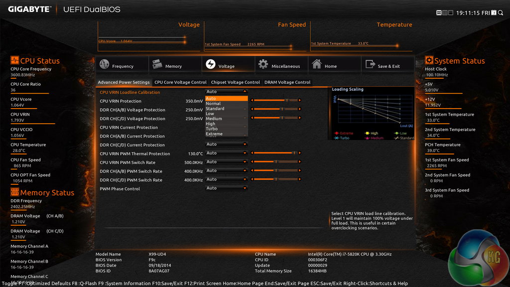 Power and voltage settings can be adjusted in the relevant subsection. Some of the parameters, such as CPU VRIN Loadline Calibration, open a graphical display to assist a user in making an appropriate choice.