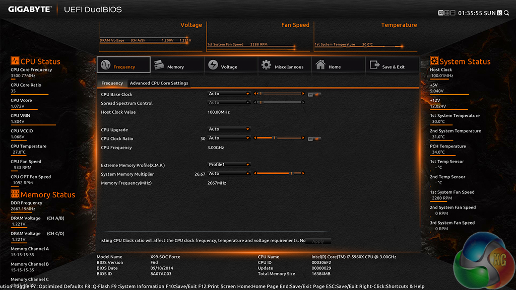 Upon entering the 1920×1080 (dependent upon your monitor’s resolution) UEFI, Gigabyte opens the frequency page. The interface packs large amounts of information into a single screen by virtue of its 1920×1080 resolution. Voltages, frequencies and other monitoring parameters are consistently scattered around the outside of each page.
