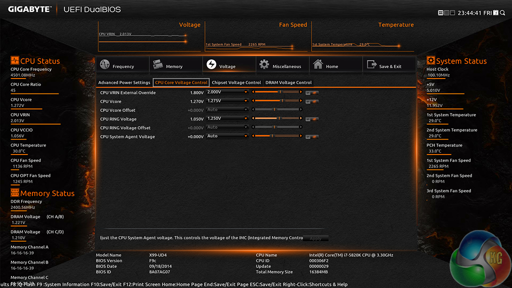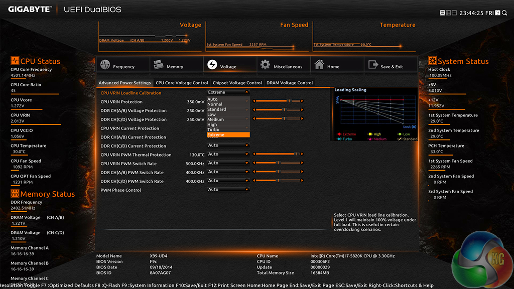 To test the Gigabyte X99-UD4 motherboard’s CPU overclocking potential, we first increased the CPU VCore to 1.275V, Cache voltage to 1.25V, and CPU Input Voltage to 2.0V. Extreme LLC was applied to ensure that our set voltage was delivered continuously.
