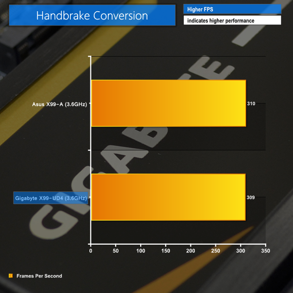 There is almost nothing to tell each motherboard apart in our CPU-related benchmarks. Gigabyte's X99-UD4 is narrowly beaten in the Cinebench and Handbrake tests, but the performance difference is too small to mean anything (0.38% for Cinebench and 0.32% for Handbrake).