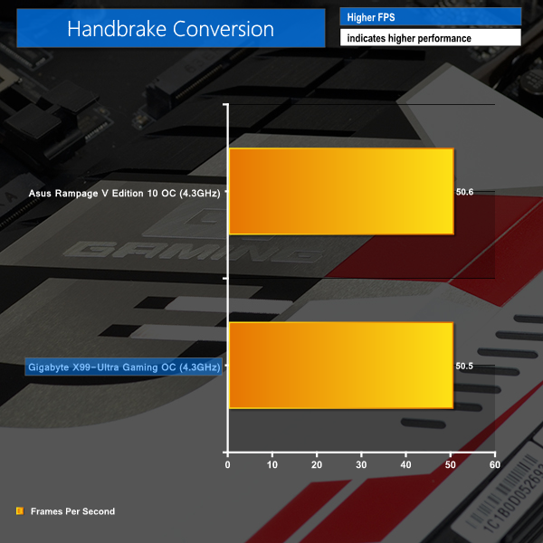 As a performance comparison, we have included the results from competing Asus X99 motherboards. The maximum overclocked configuration achieved with each board was a 4300MHz (43 x 100MHz) processor frequency and 3.4GHz CPU Cache speed, whilst using 3200MHz CL14 memory.