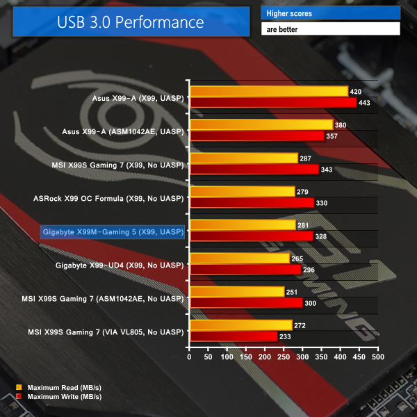 Provided by the X99 chipset, transfer rates for Gigabyte's USB 3.0 ports are typical for an X99 solution. Without UASP-activating software for Windows 7 users, Gigabyte's X99M-Gaming 5 cannot touch the USB 3.0 speeds offered by Asus' parts.