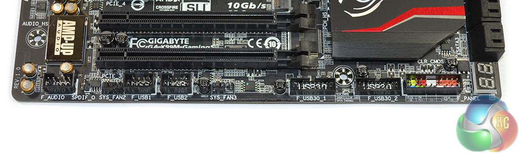 The usual array of front panel headers is found along the board's bottom edge. Gigabyte also chooses this area as the location for both USB 3.0 headers. That's not a smart move – the ports will be blocked by a large graphics card installed in either of the bottom two PCIe slots.