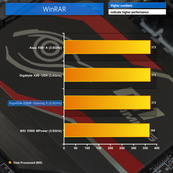 WinRAR’s built in benchmark and hardware test can help us outline the performance differentials between each motherboard. We record the amount of data processed after a 30-second run.