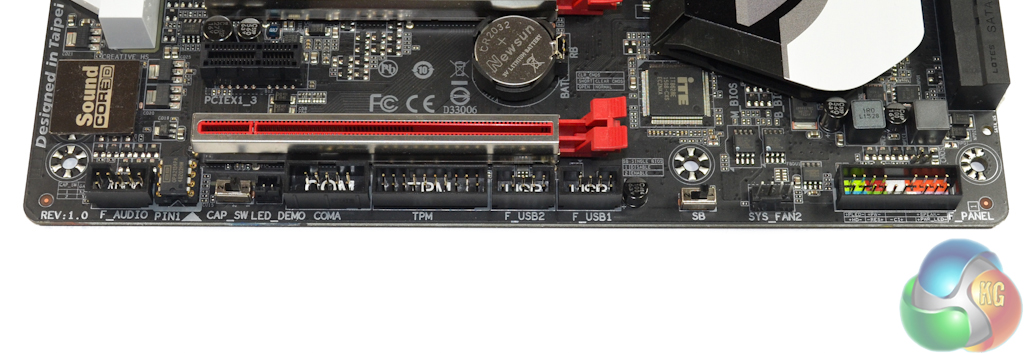 The standard affair of ports is found along the board's bottom edge. In addition to front panel audio and chassis headers, as well as USB 2.0 outputs, Gigabyte includes TPM and COM headers.