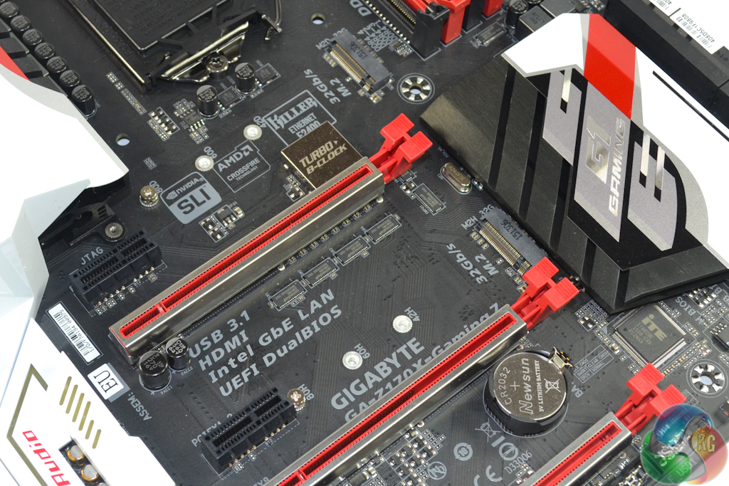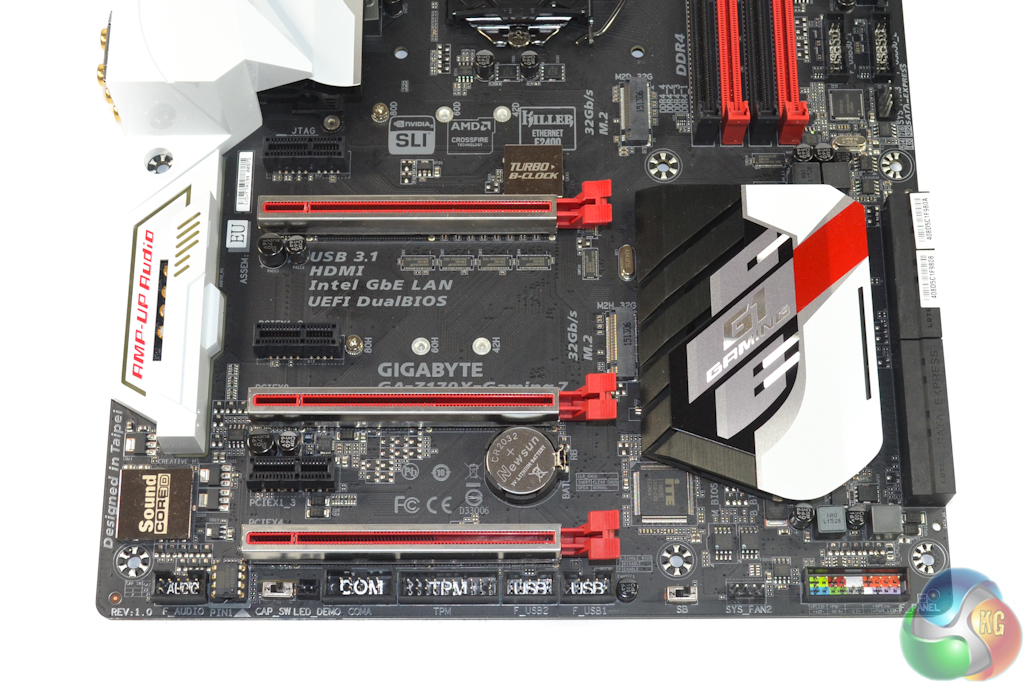 Plentiful bandwidth from the Z170 chipset allows Gigabyte to provide a pair of PCIe 3.0 x4 32Gbps M.2 connectors. Both can be used simultaneously, they support RAID over PCIe, and SATA M.2 SSDs can be installed. One downside is that the lower connector becomes unusable if an expansion card is positioned in the lowermost full-length PCIe slot.